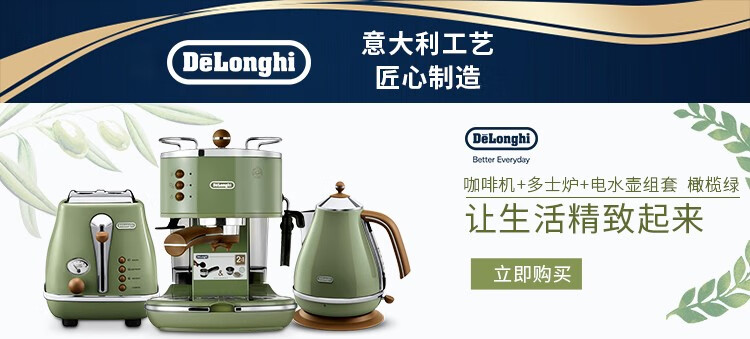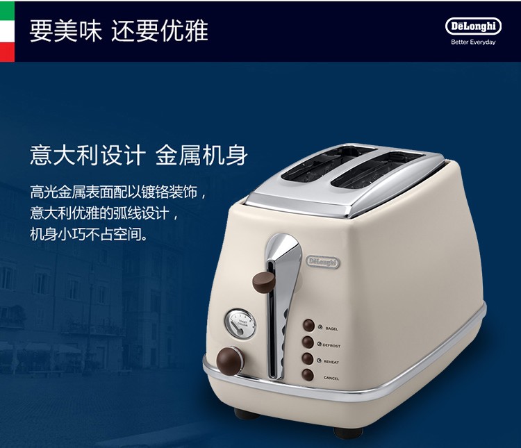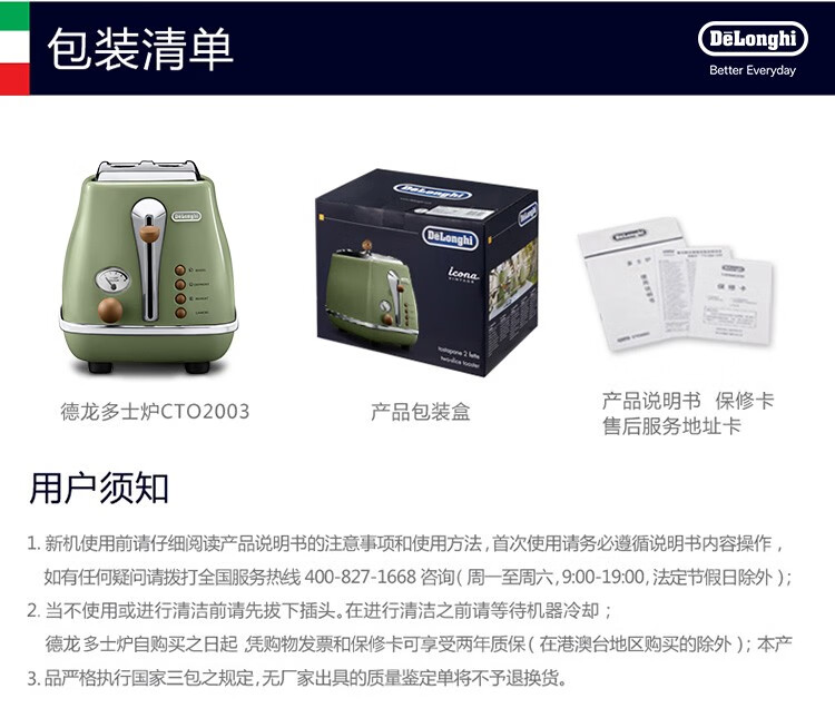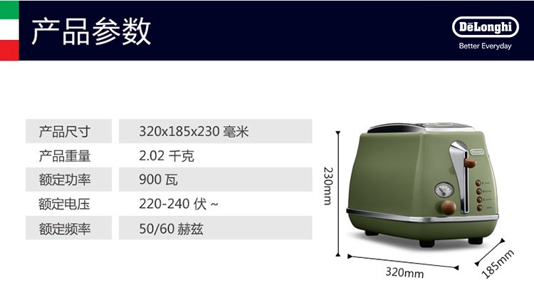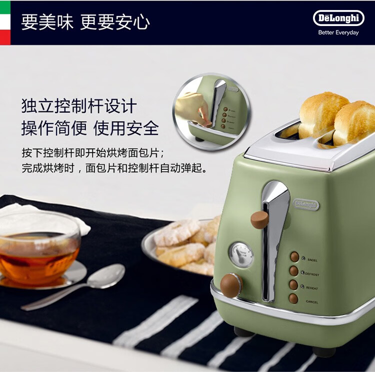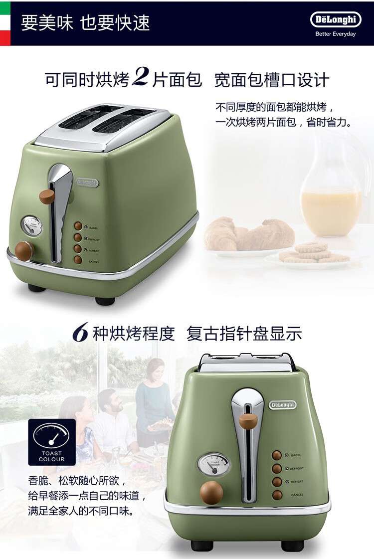 Delonghi Delonghi Toaster Oven Toast Slice Oven Household Bread Slicer 2-Slice Breakfast Warming Machine CTO2003.VGR Olive Green CTO2003.VGR Olive Green
