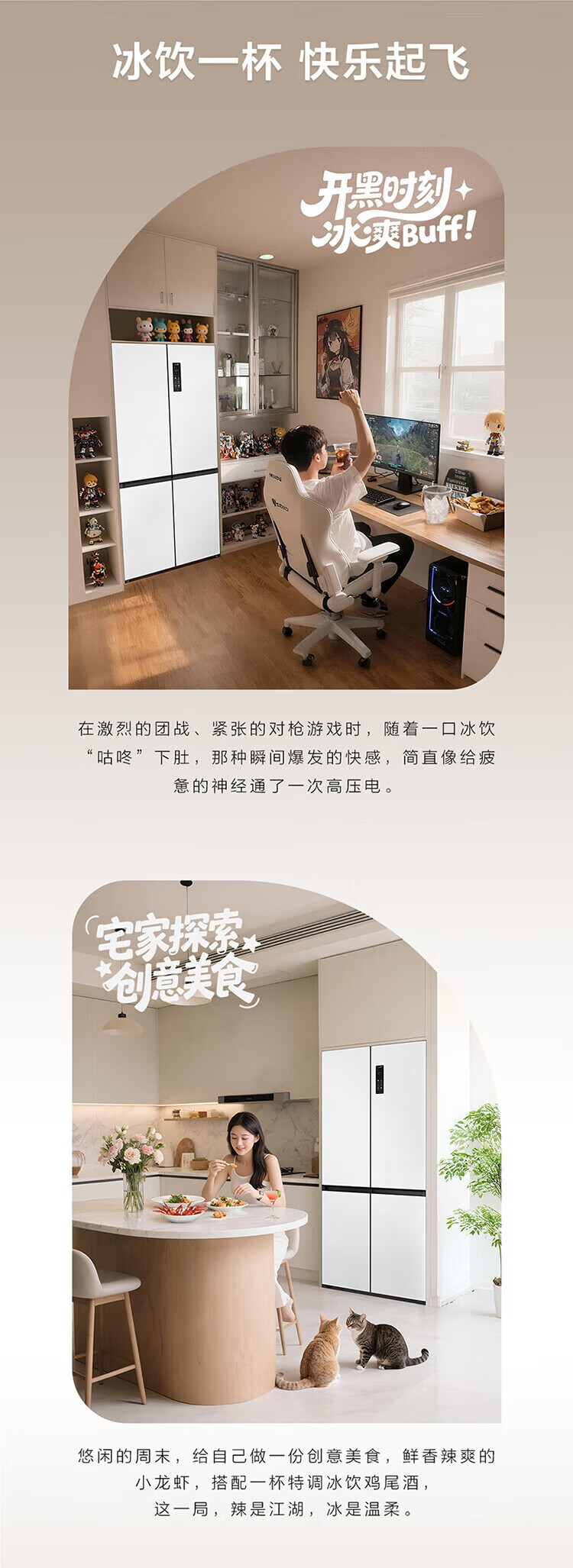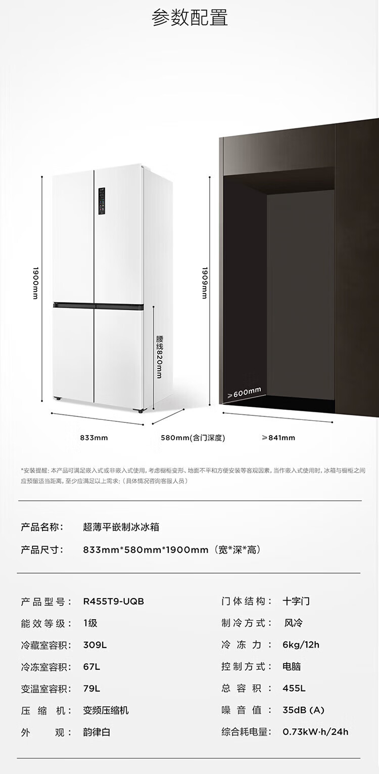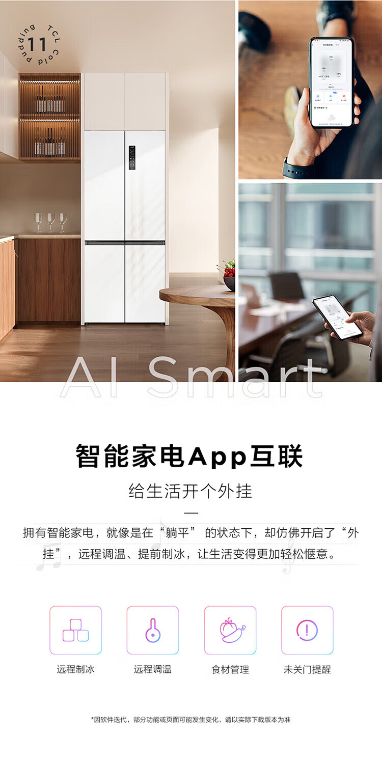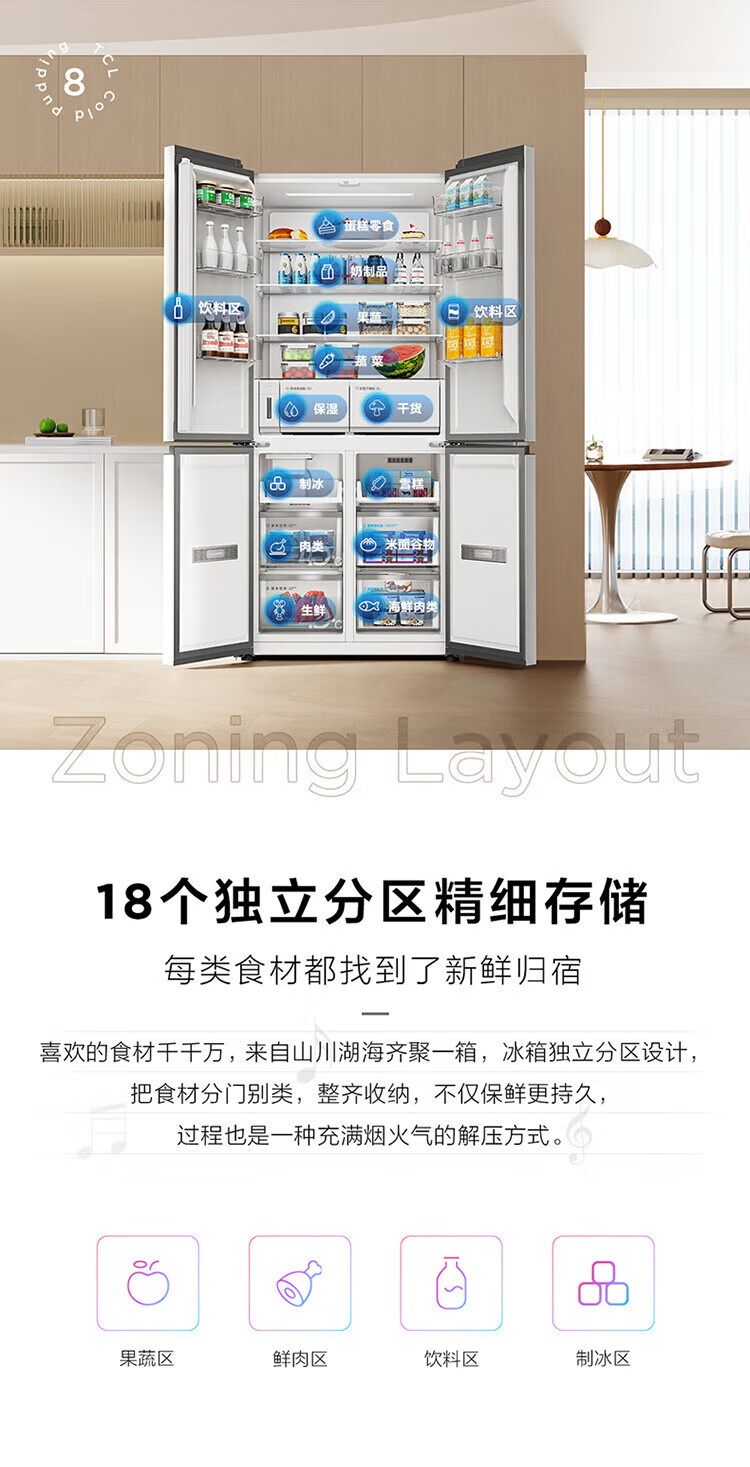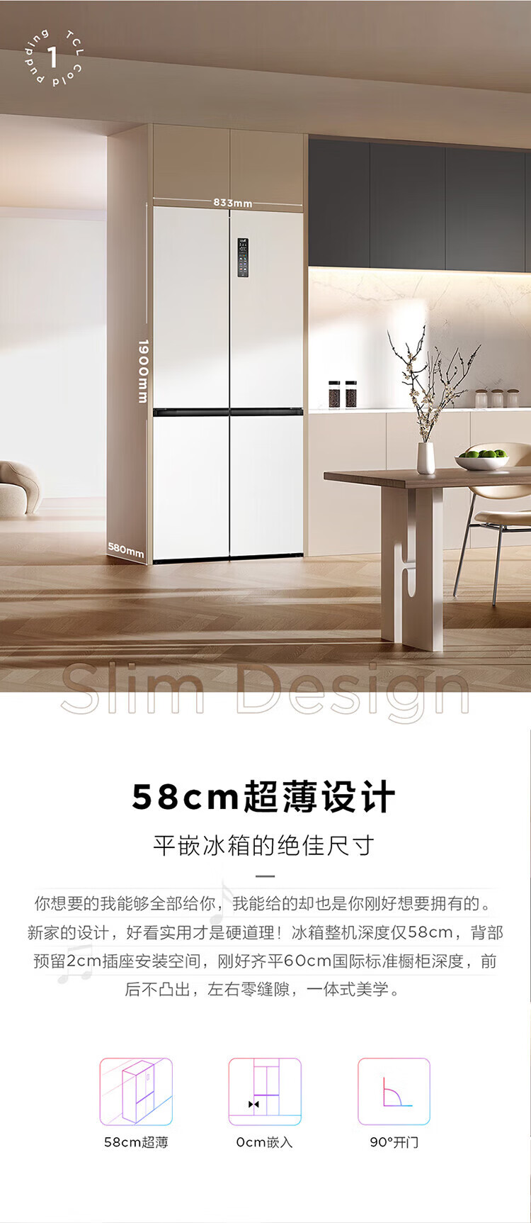 TCL cold pudding 455 liter cross four-door 58cm ultra-thin zero-embedded fully automatic ice making - 40 degrees slow melting ice side-by-side large capacity household first-class energy efficiency refrigerator R455T9-UQB Rhythm White
