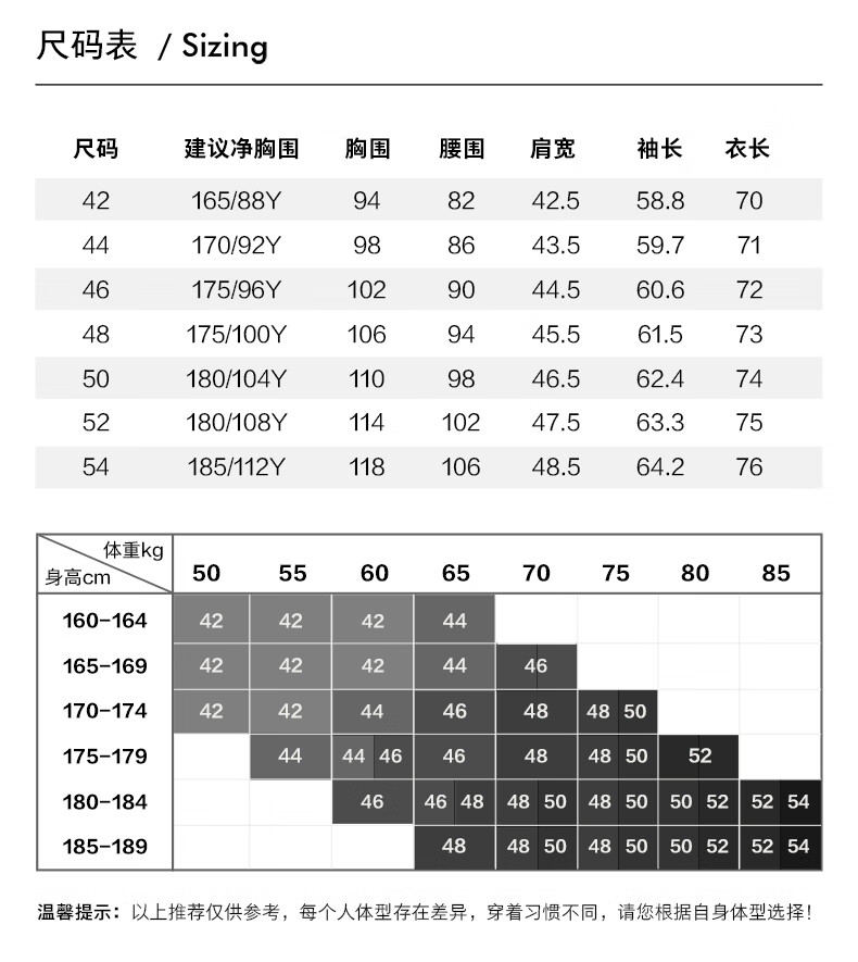 China (cm) 165 / 88-90 170 / 96-98 175 / 108-110 180 / 118-122 185 / 126-130