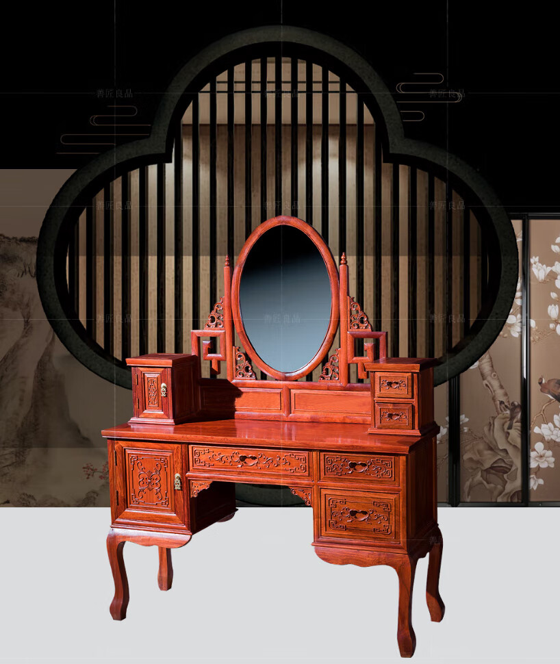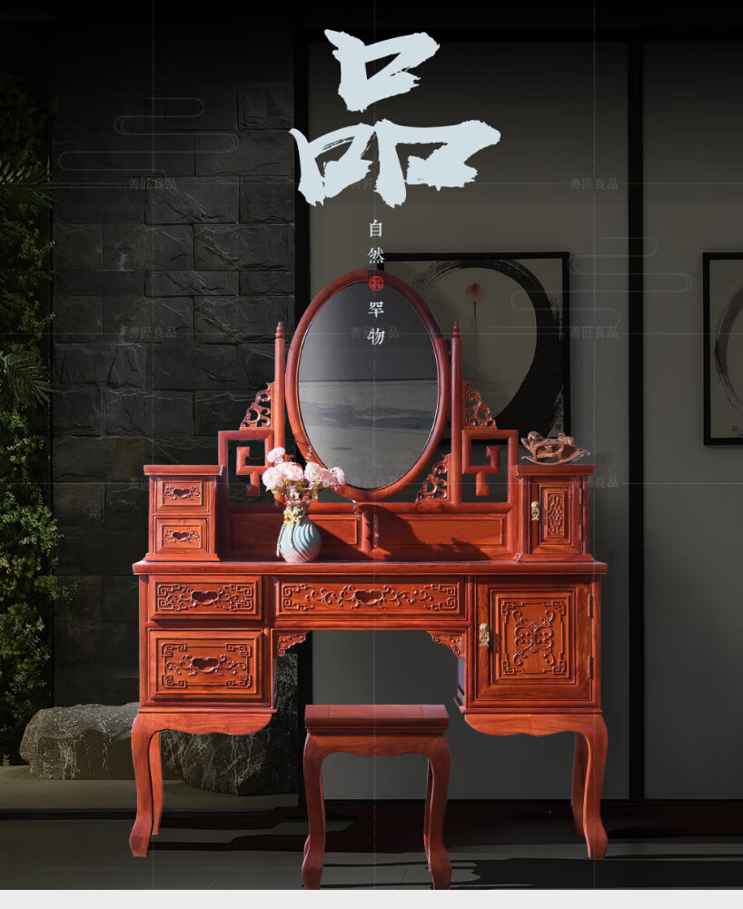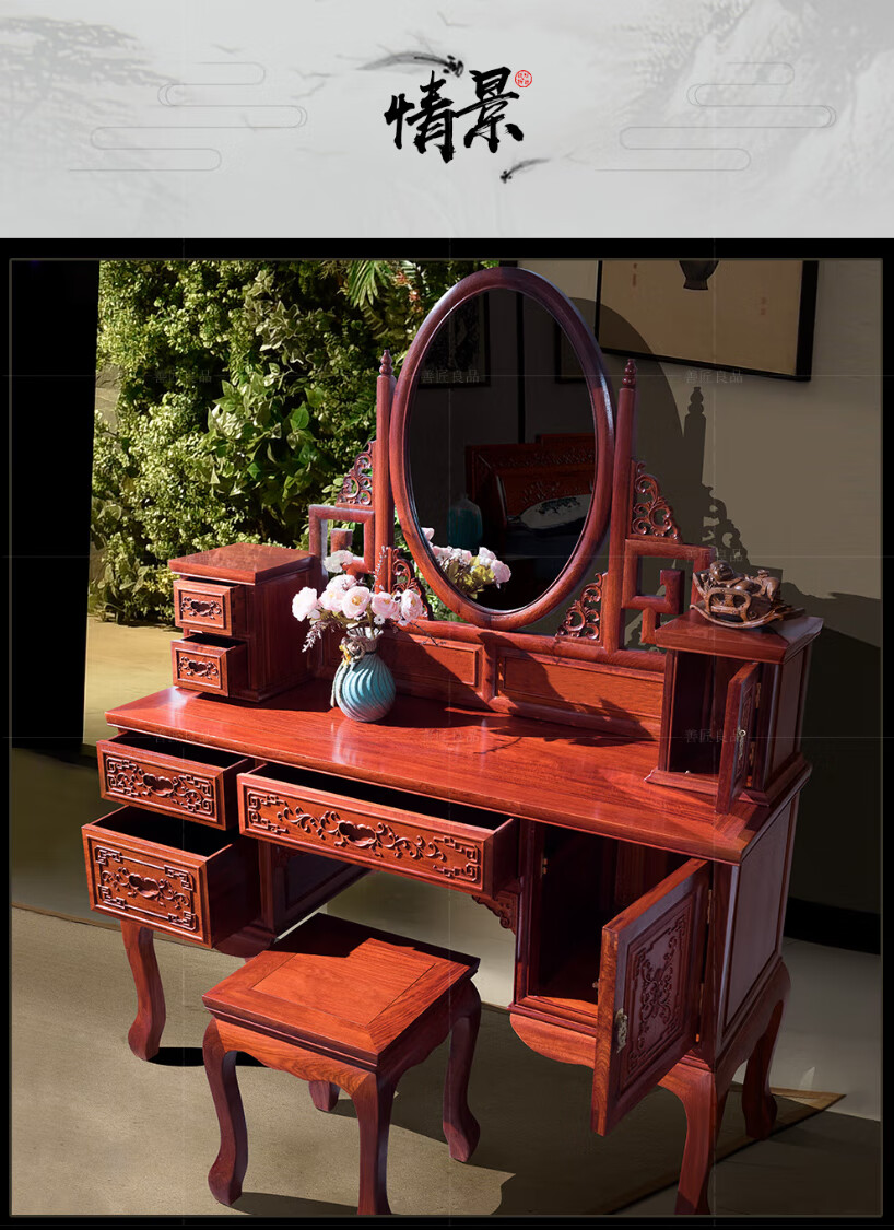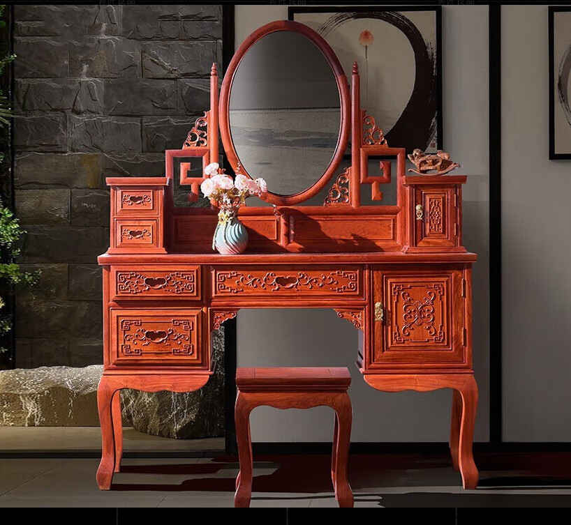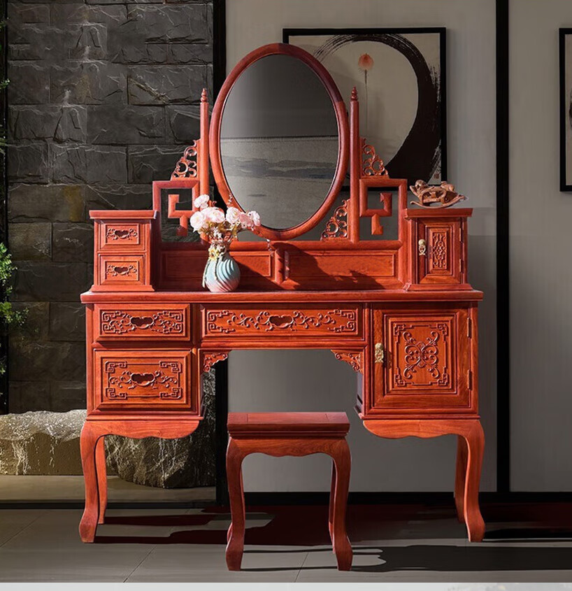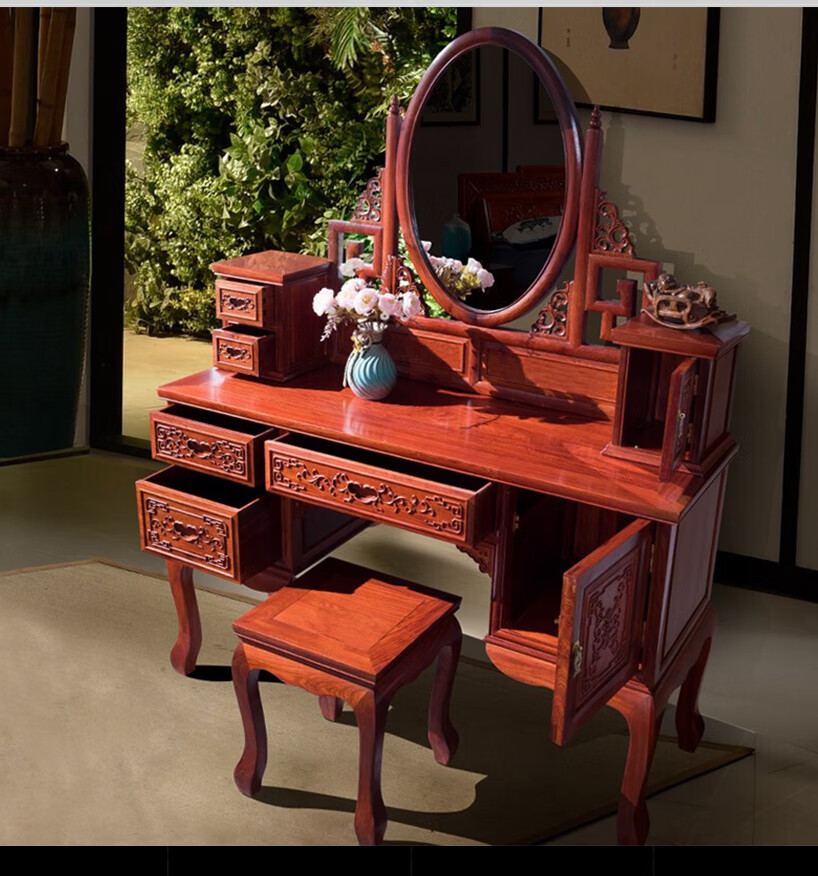 Good craftsman and good product, mahogany furniture, Burmese rosewood (scientific name: Big fruit rosewood), Chinese style dressing table solid wood with lockers and drawers dressing table combination, foreign flower dressing table + dressing stool combination
