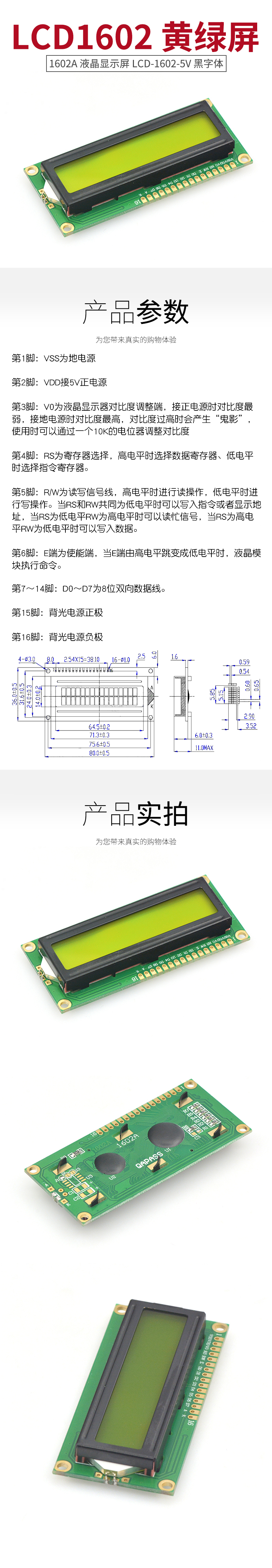 TaoTimeClub LCD1602 yellow-green screen 1602A LCD display LCD-1602-5V black font