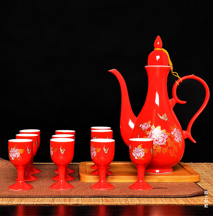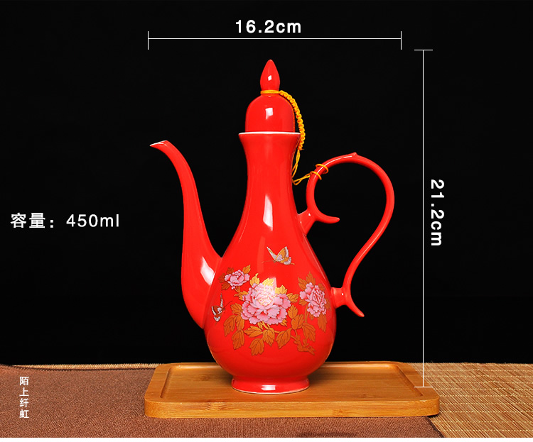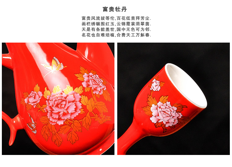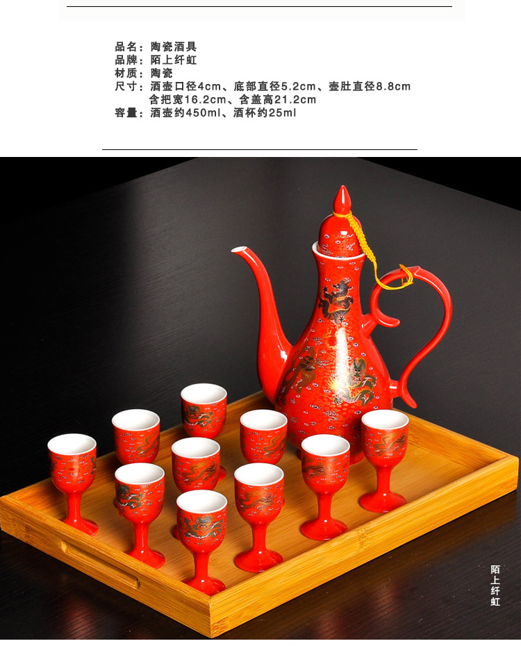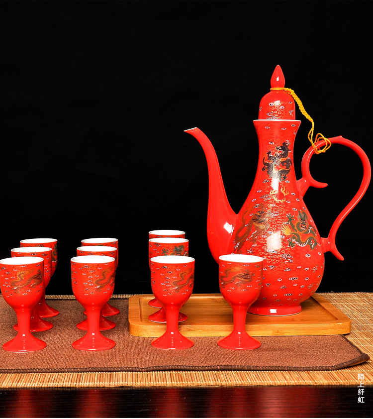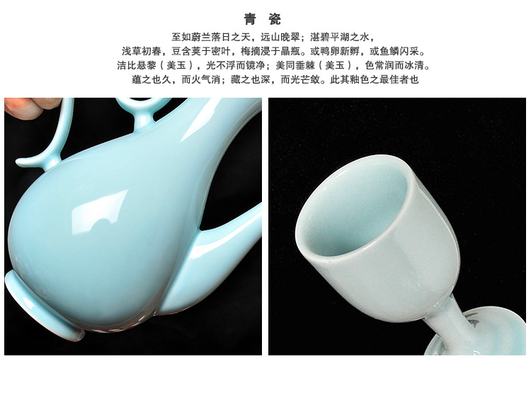 Mo Shang Xianhong ceramic wine set wedding liquor sake cup Qing style retro flask Chinese style household Xianglong high-end gift box set celadon style (gift box with porcelain tray)