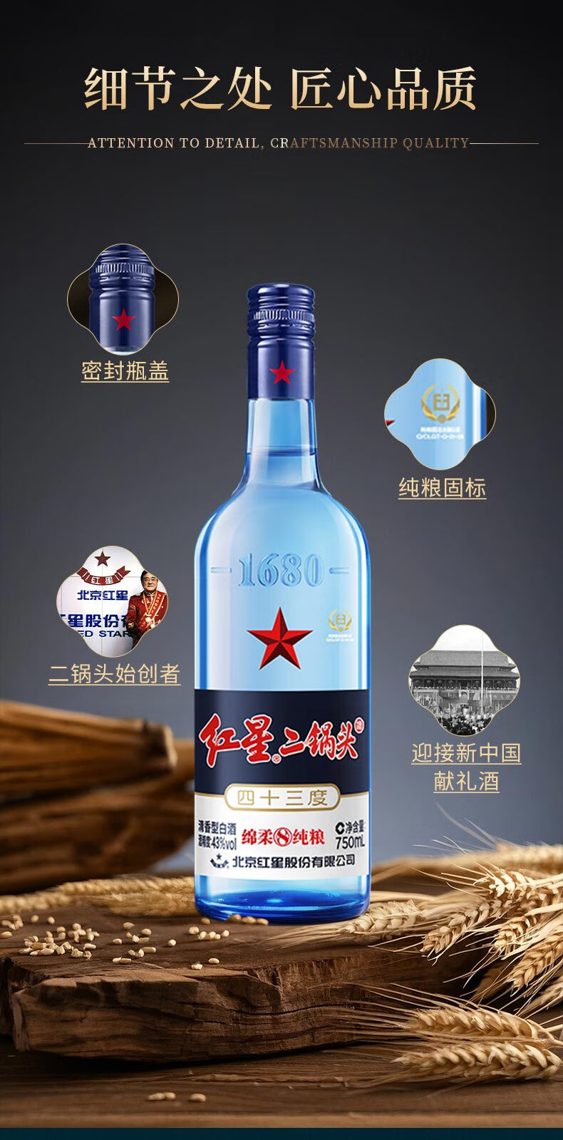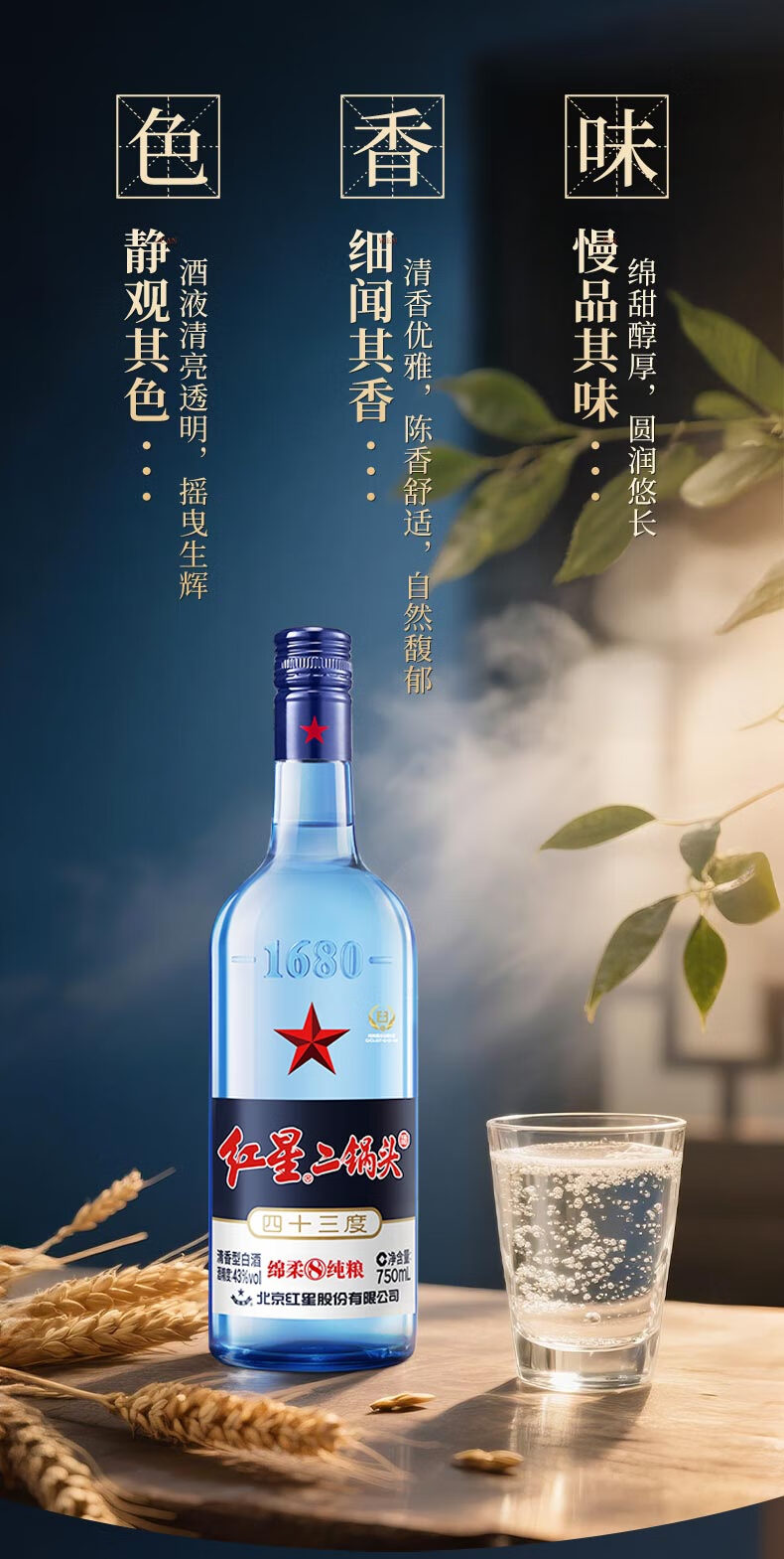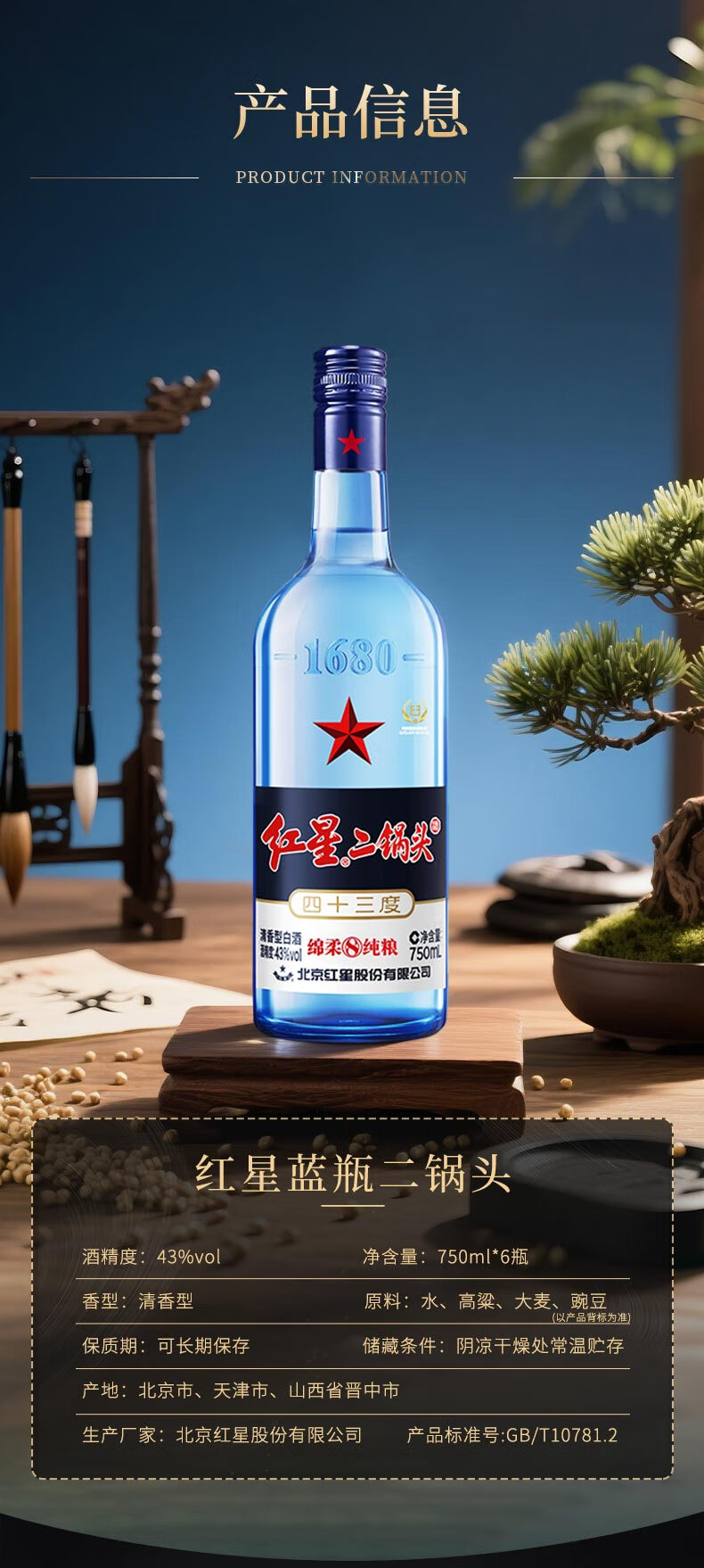 Red Star Erguotou Blue Bottle Mianrou 8-year-old fragrance liquor 43 degrees 750ml*6 bottles full box ration wine