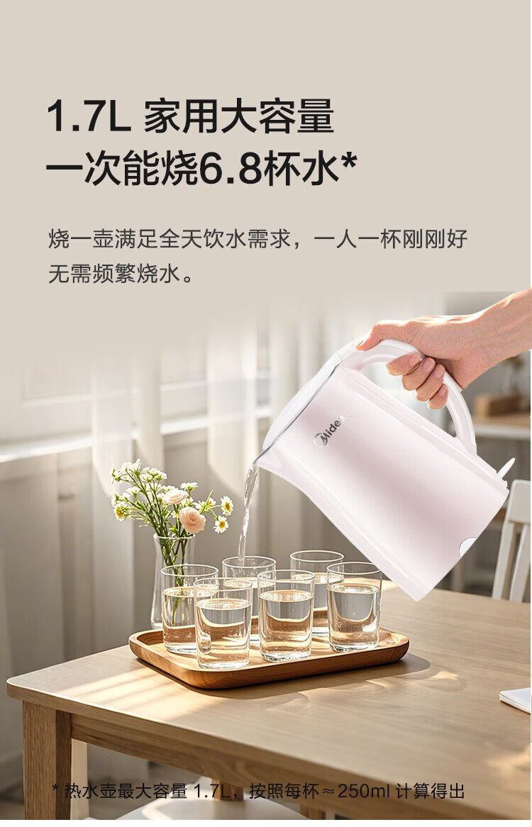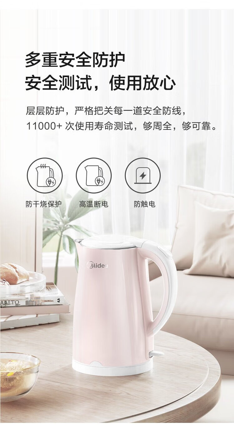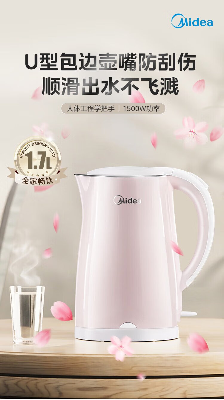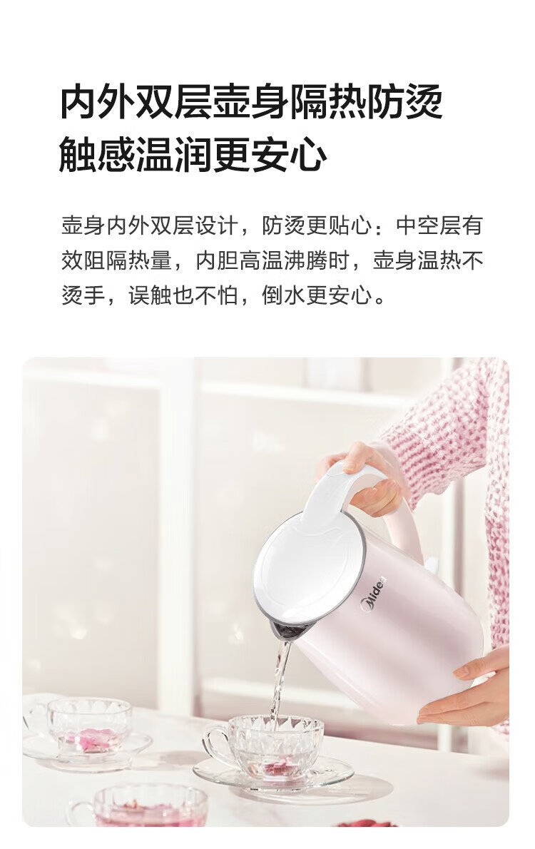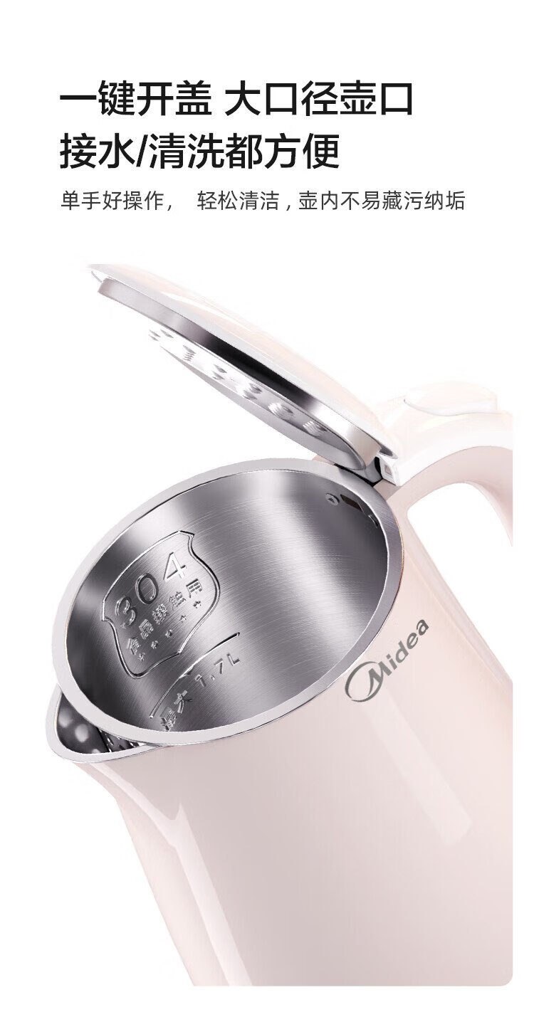 Midea electric kettle electric kettle kettle double-layer anti-scalding price guarantee 11.11 0 coating food grade 304 stainless steel 1500W fast boiling 1.7L large capacity HJ1705