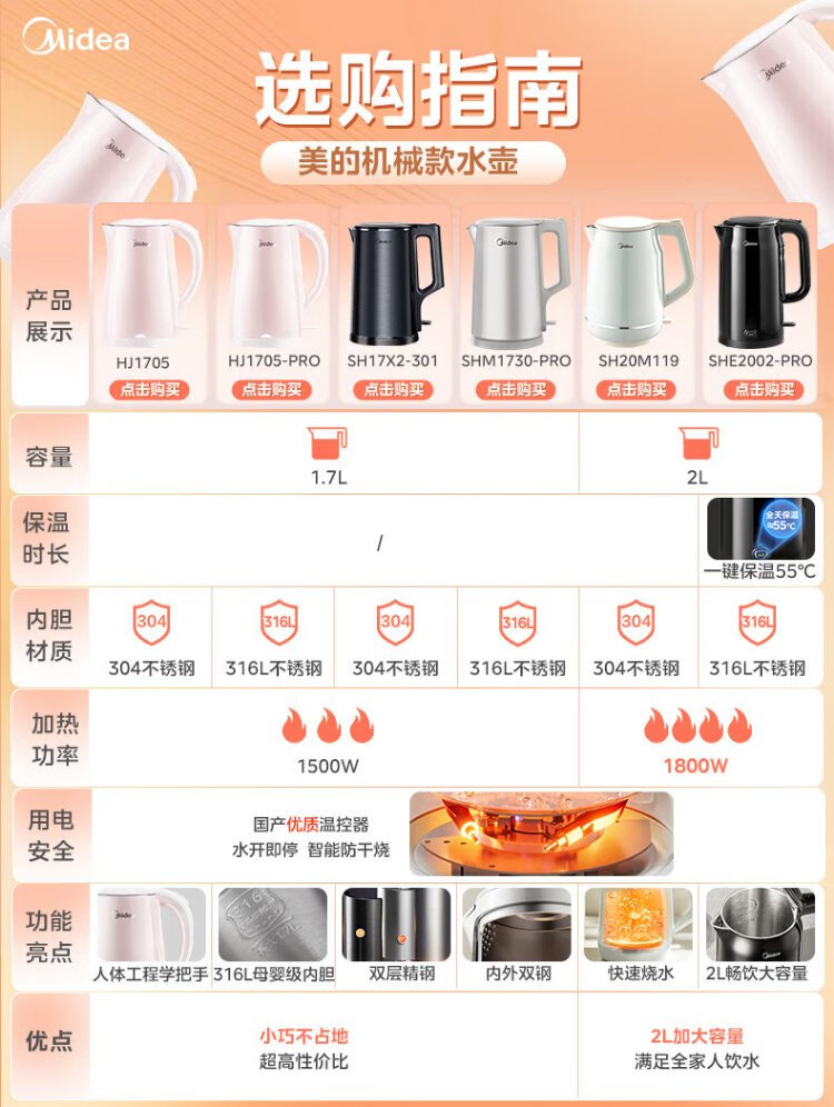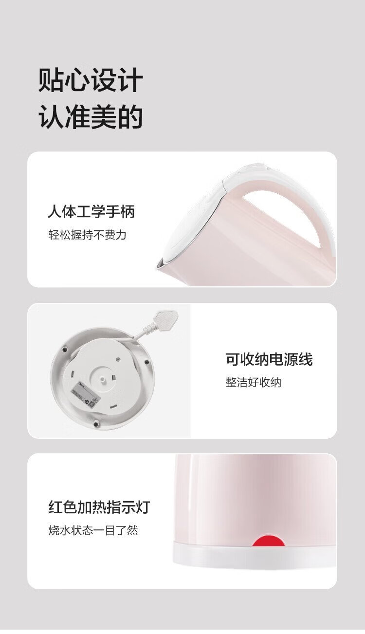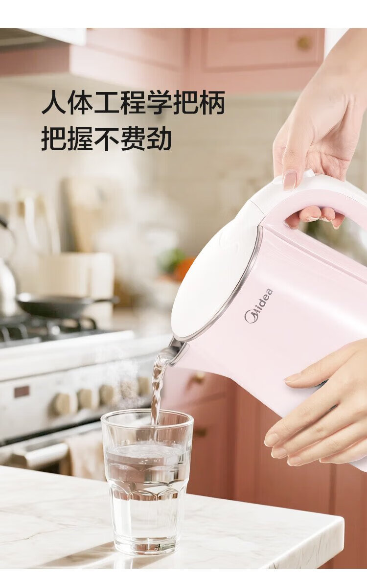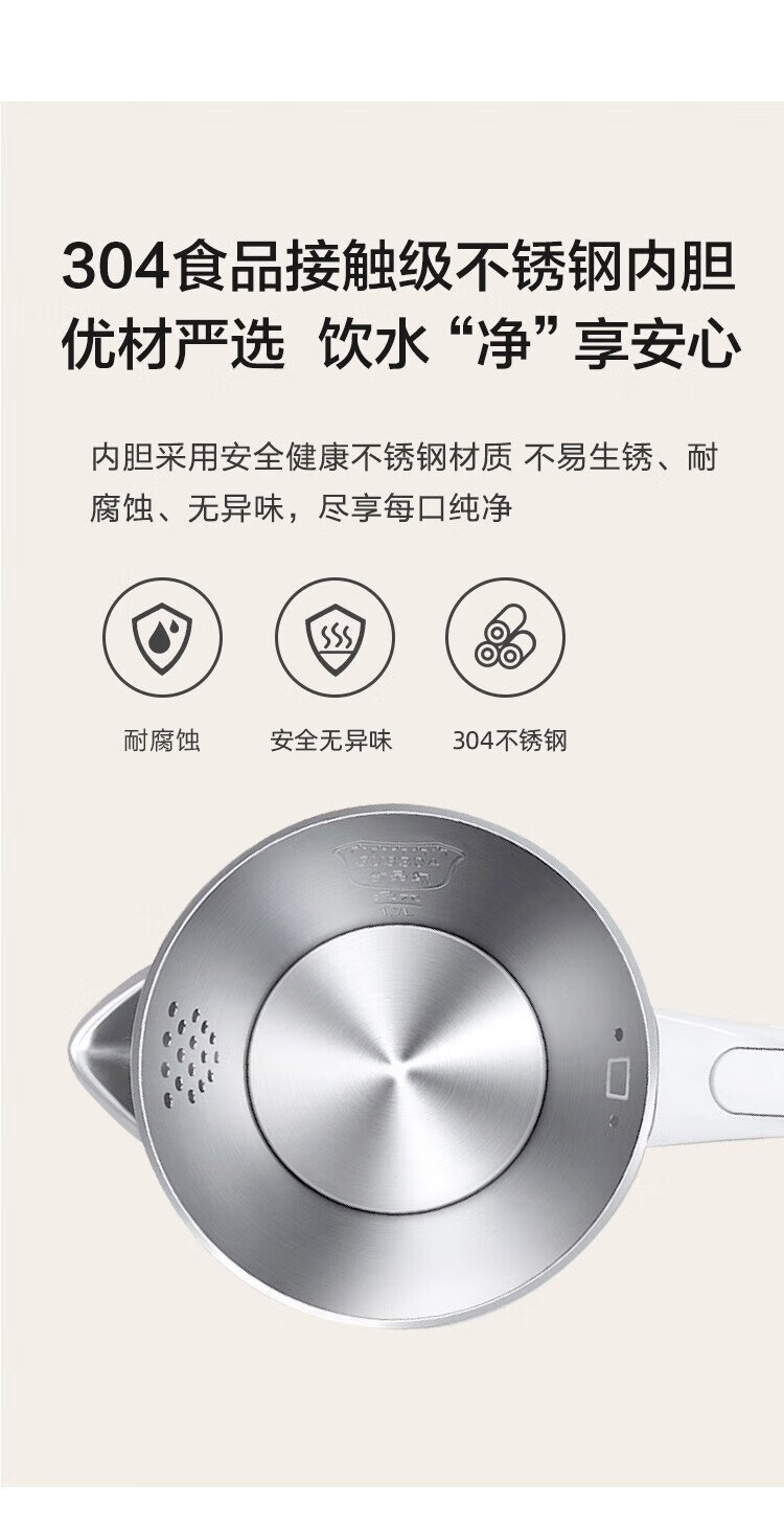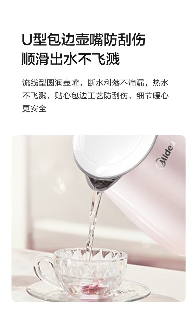Midea electric kettle electric kettle kettle double-layer anti-scalding price guarantee 11.11 0 coating food grade 304 stainless steel 1500W fast boiling 1.7L large capacity HJ1705