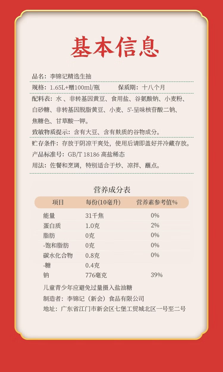 Lee Kum Kee Selected Series Selected Light Soy Sauce 1.75L Special Grade 0 Added Preservatives Brewed Soy Sauce