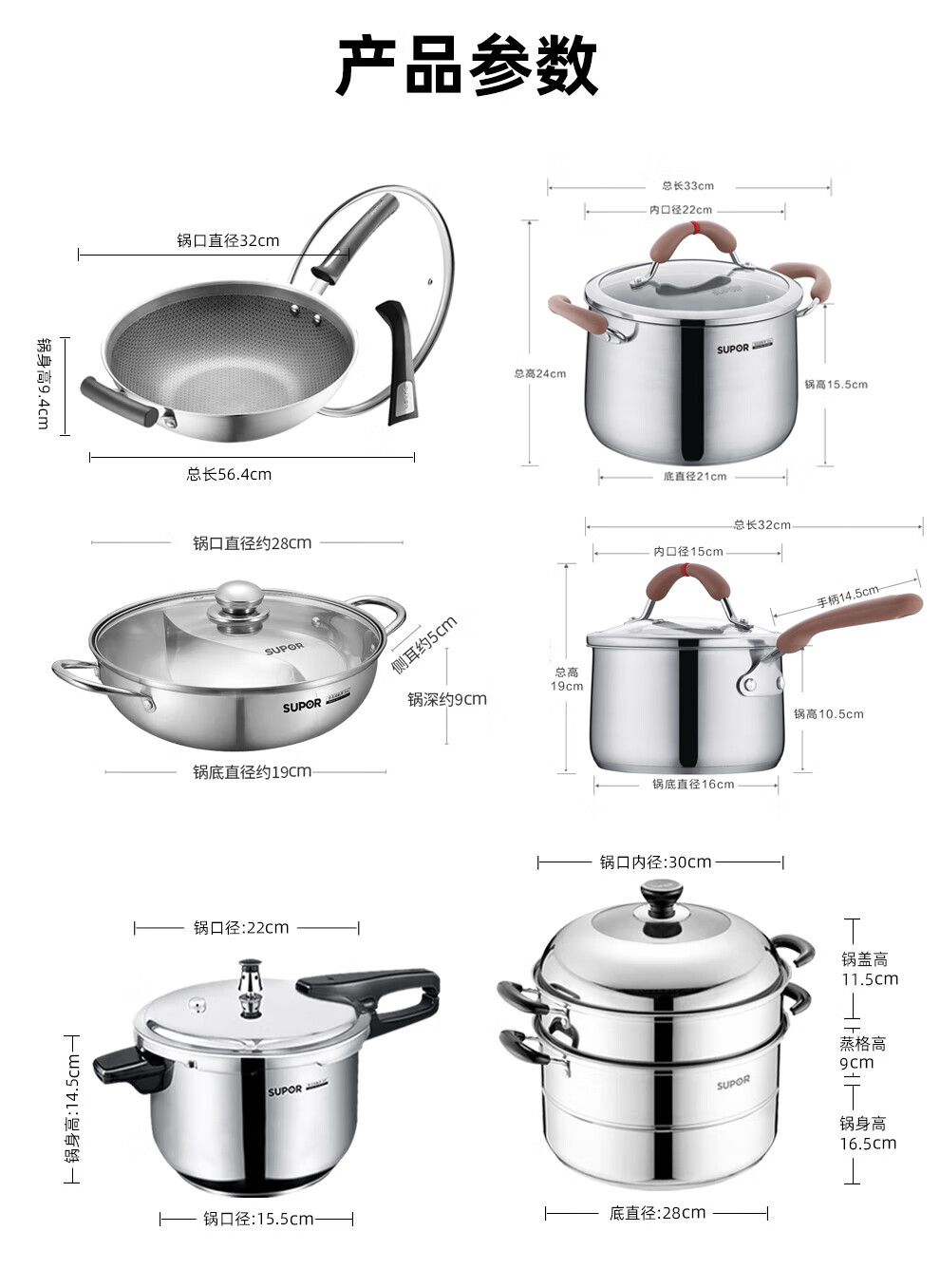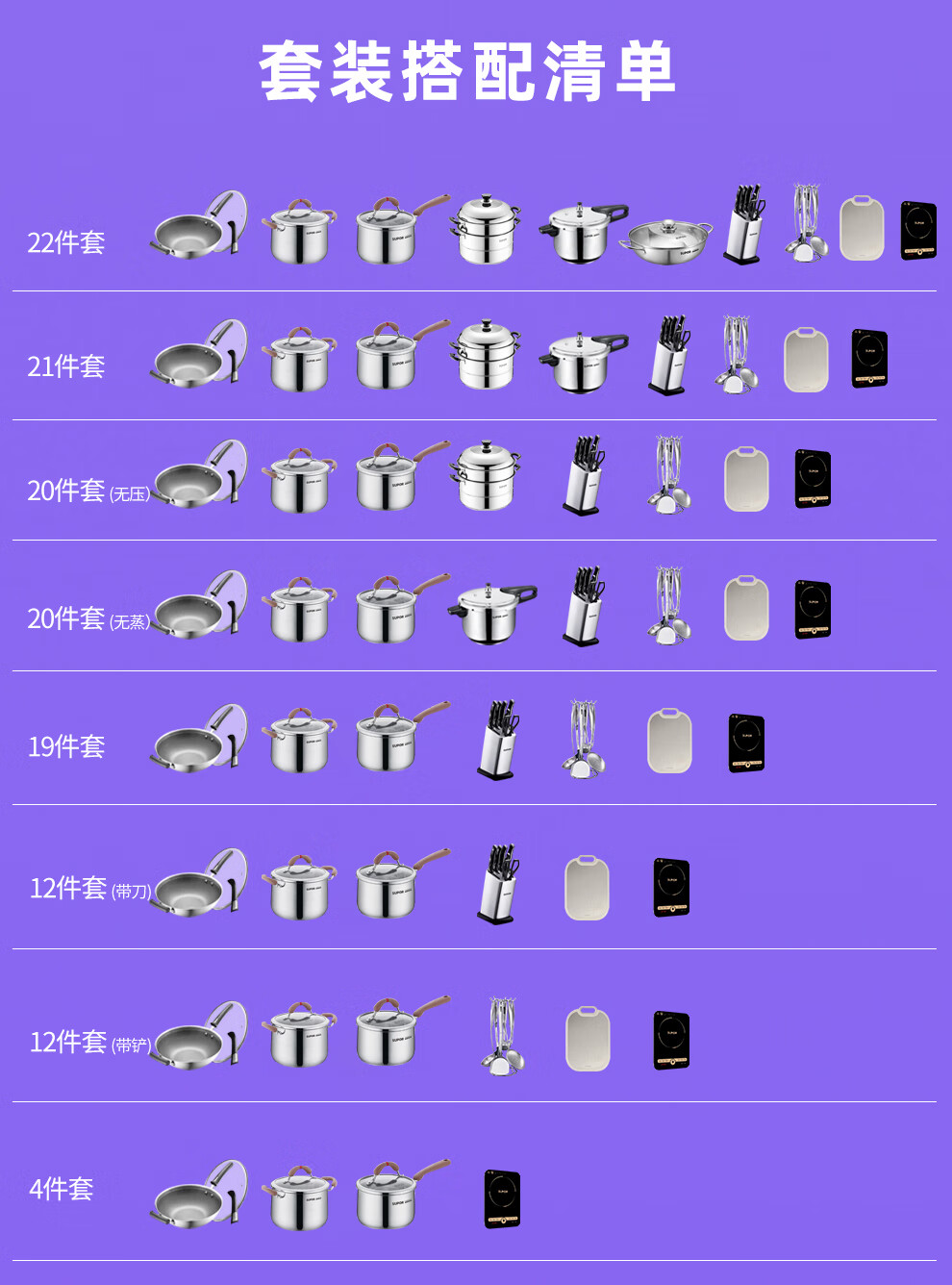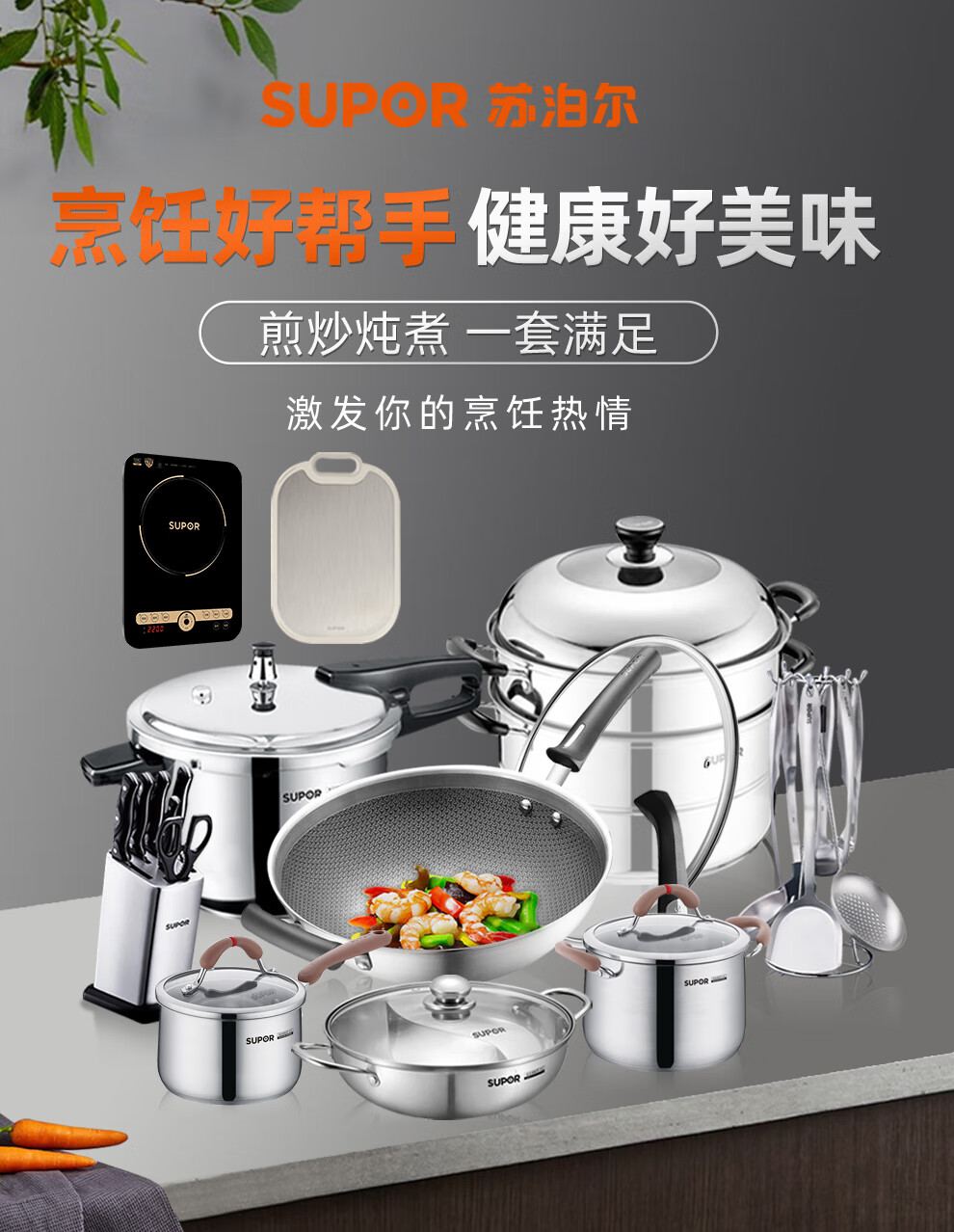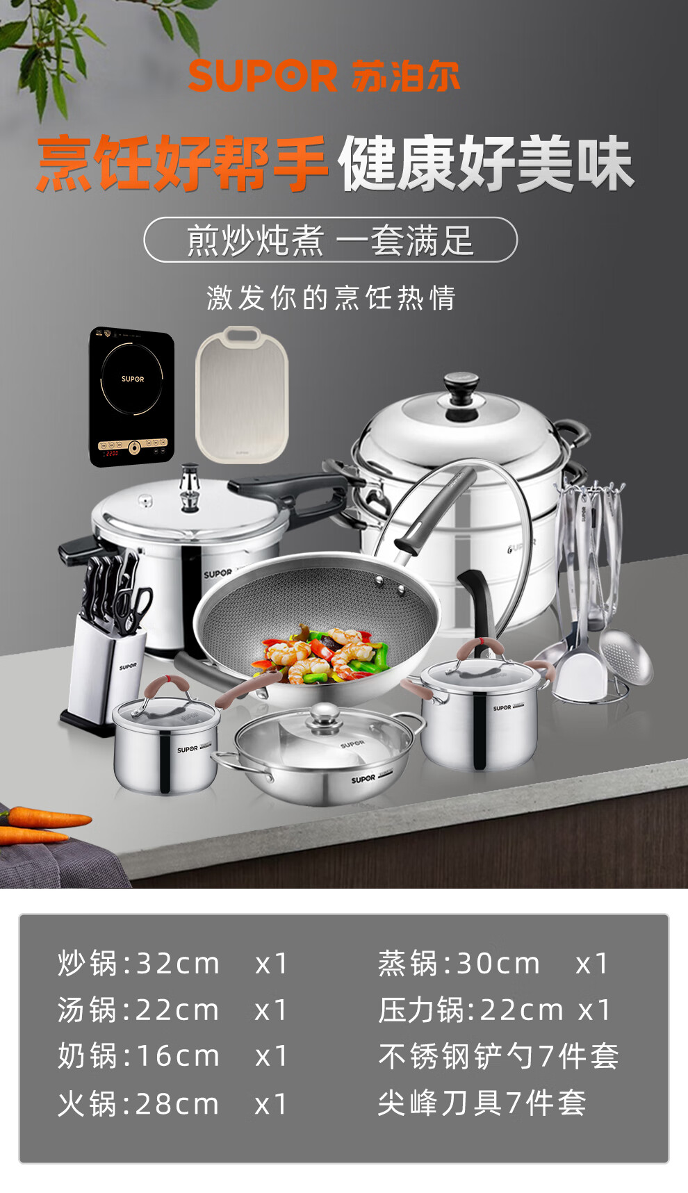SUPOR kitchenware set, stainless steel pot set, wok, hot pot, soup, milk pot, pressure cooker, steamer set, knife set, shovel spoon, cutting board, exquisite 22-piece set