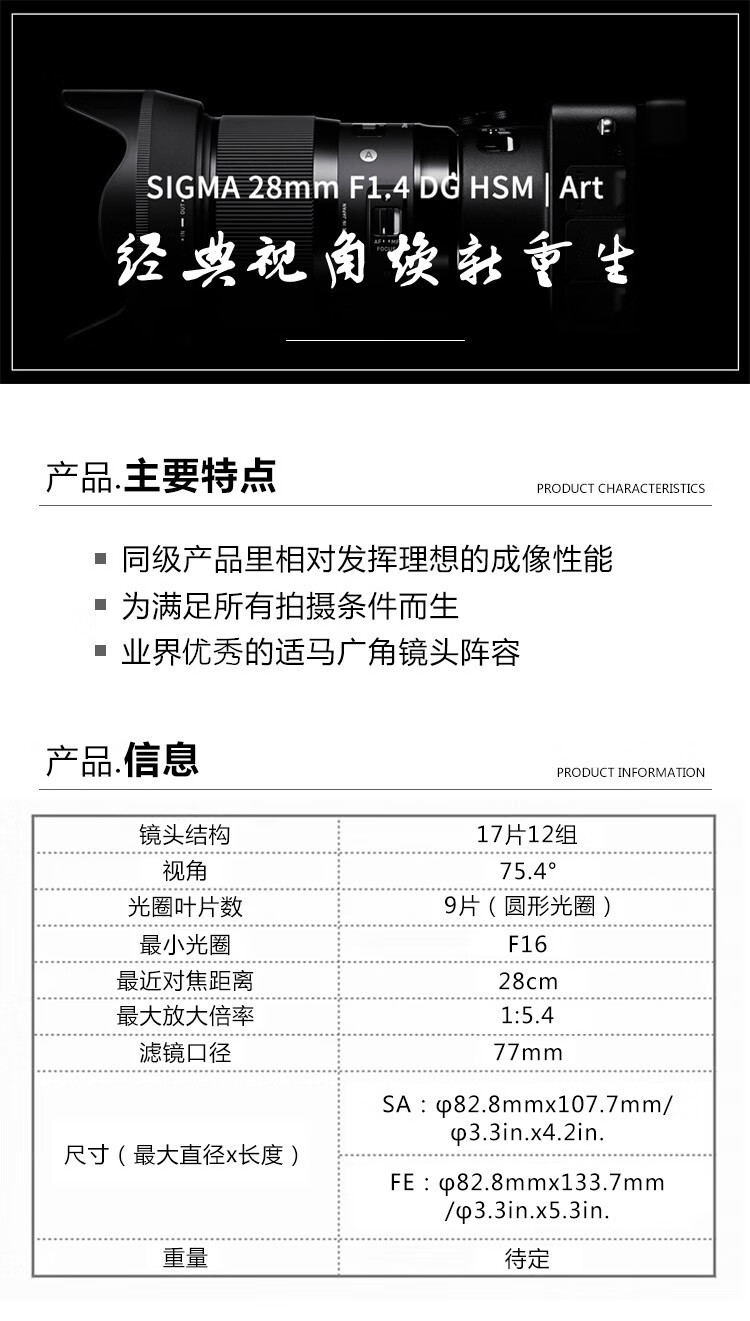 SIGMA Art 28mm F1.4 DG HSM Art series constant large aperture wide-angle fixed focus lens Canon port