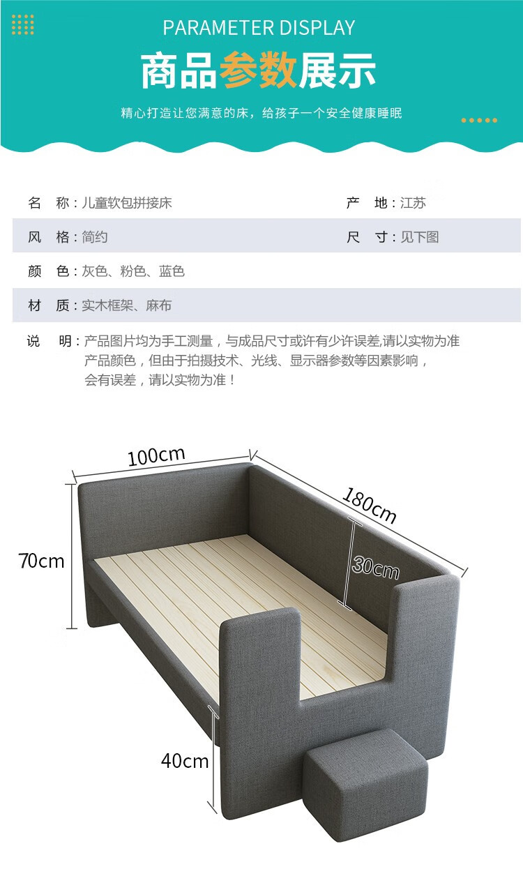 British and American Danny fabric children's solid wood spliced bed with guardrails baby side bed princess bed extra wide bed baby soft bag bed can be customized three-sided guardrails + mattress length, width and height 180*60*40 - gray