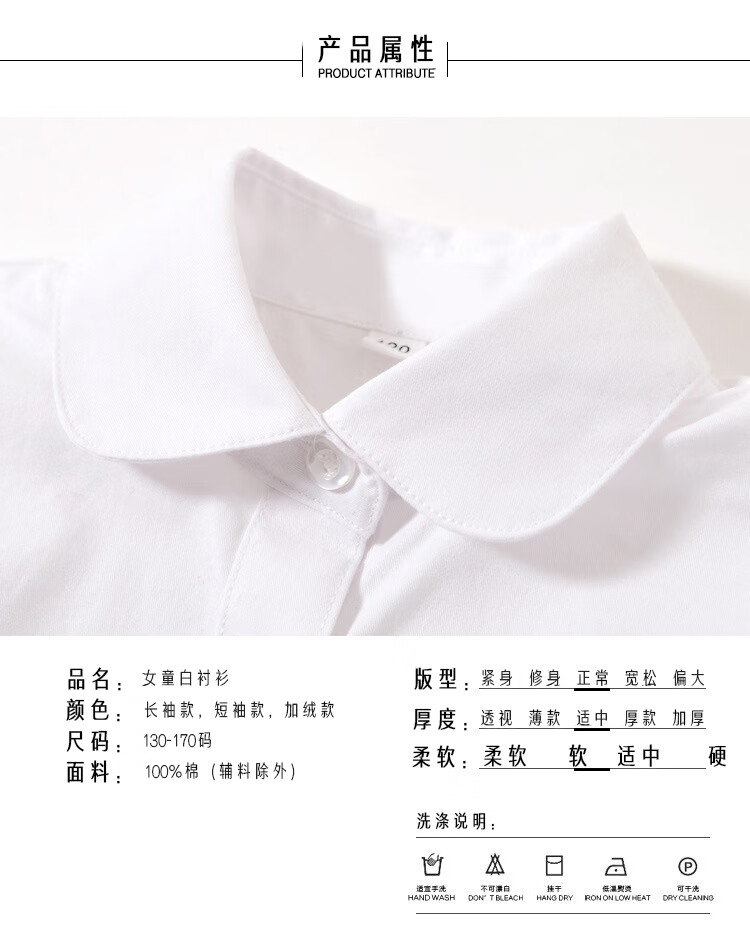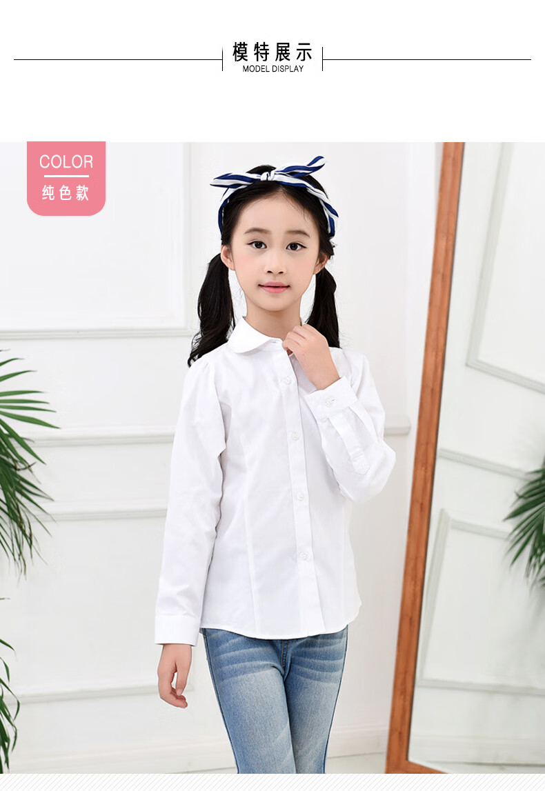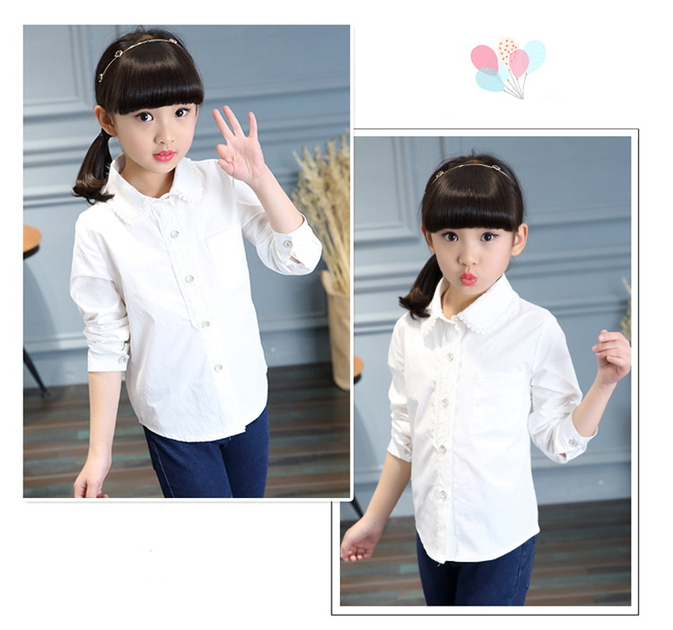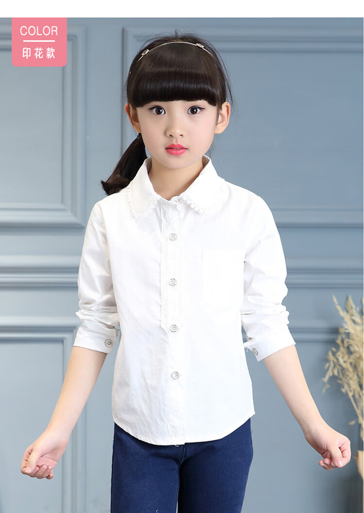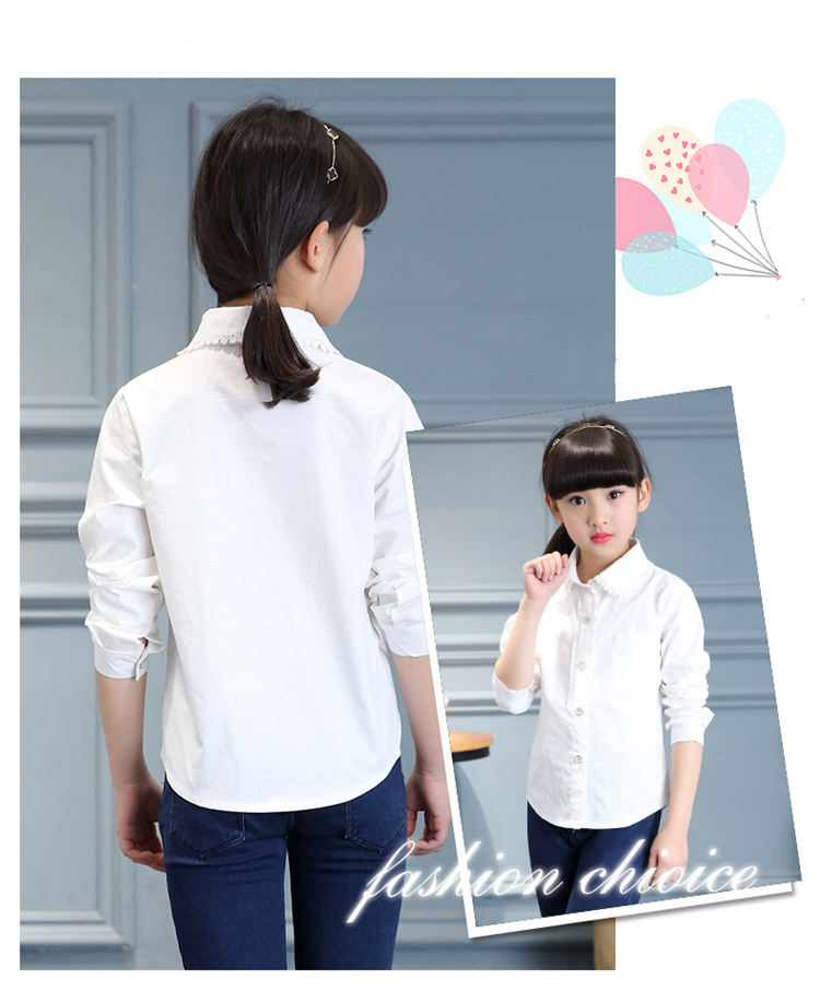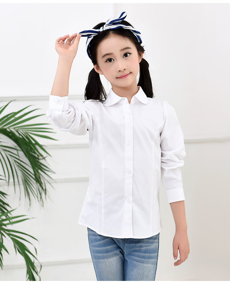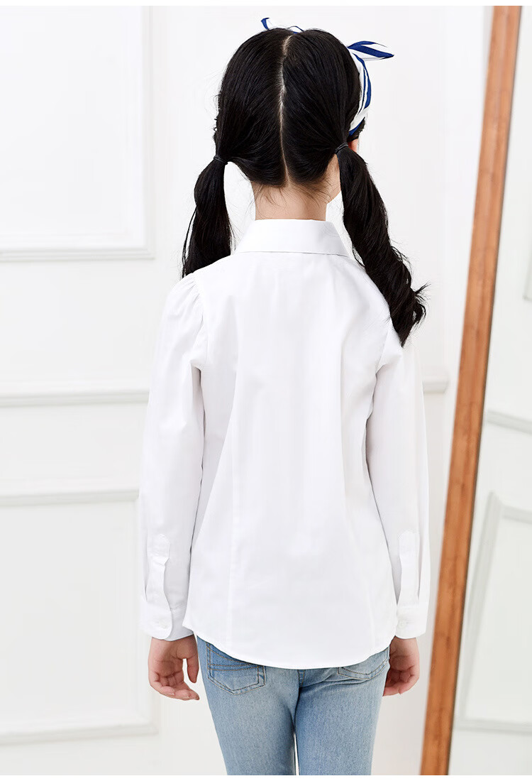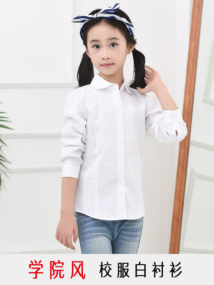 Jiuyu's children's shirt girls pure cotton white shirt casual white long-sleeved shirt student solid color top solid color 150 (suitable for 141-150cm height)