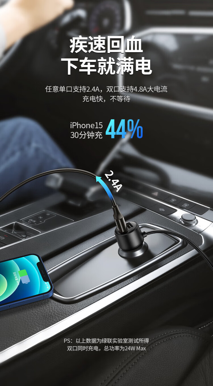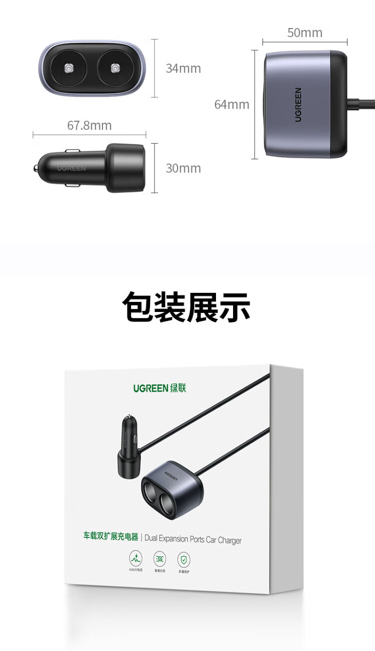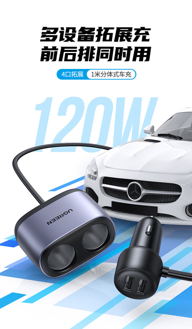 Greenlink car charger cigarette lighter one to two/three converter plug extension 120W fast charging