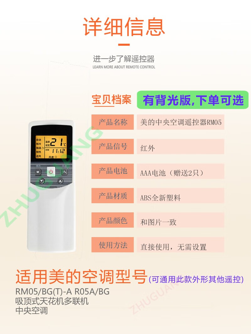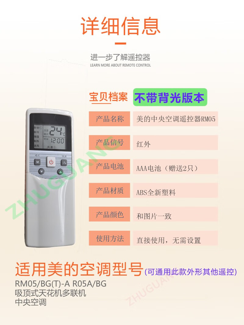Zhuguang is suitable for Midea central air conditioner remote control RM05/BG(T)-A pass R05A/BG ceiling-mounted unit multi-connection with backlight RM05/BG with backlight