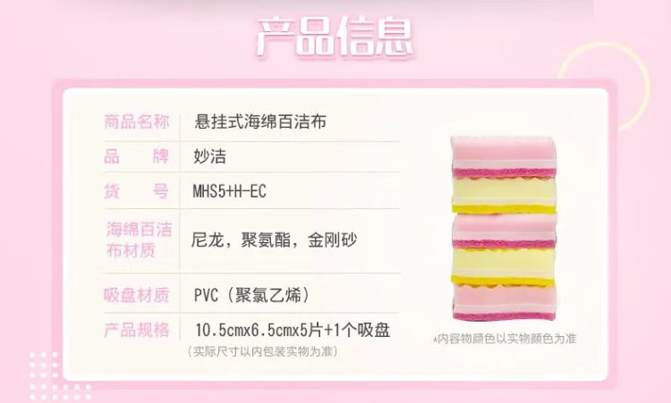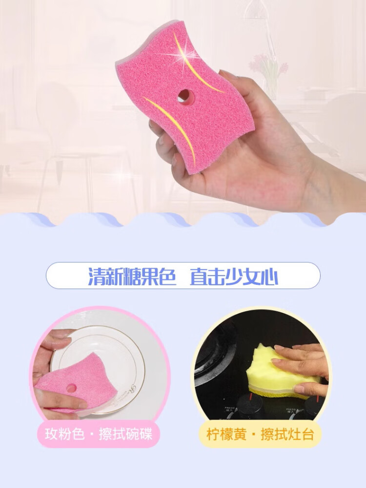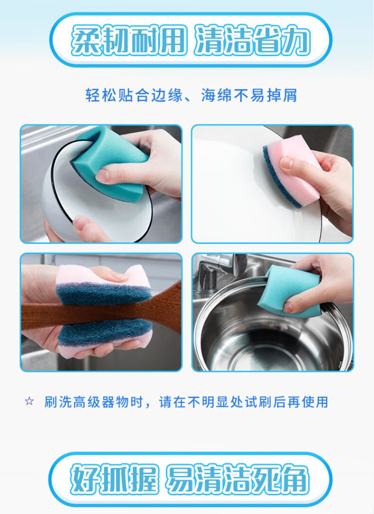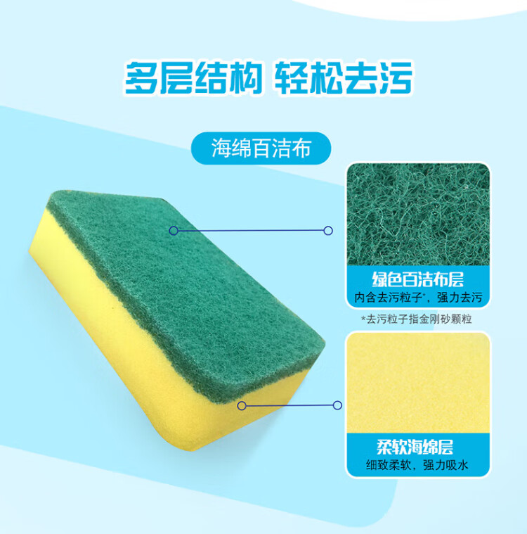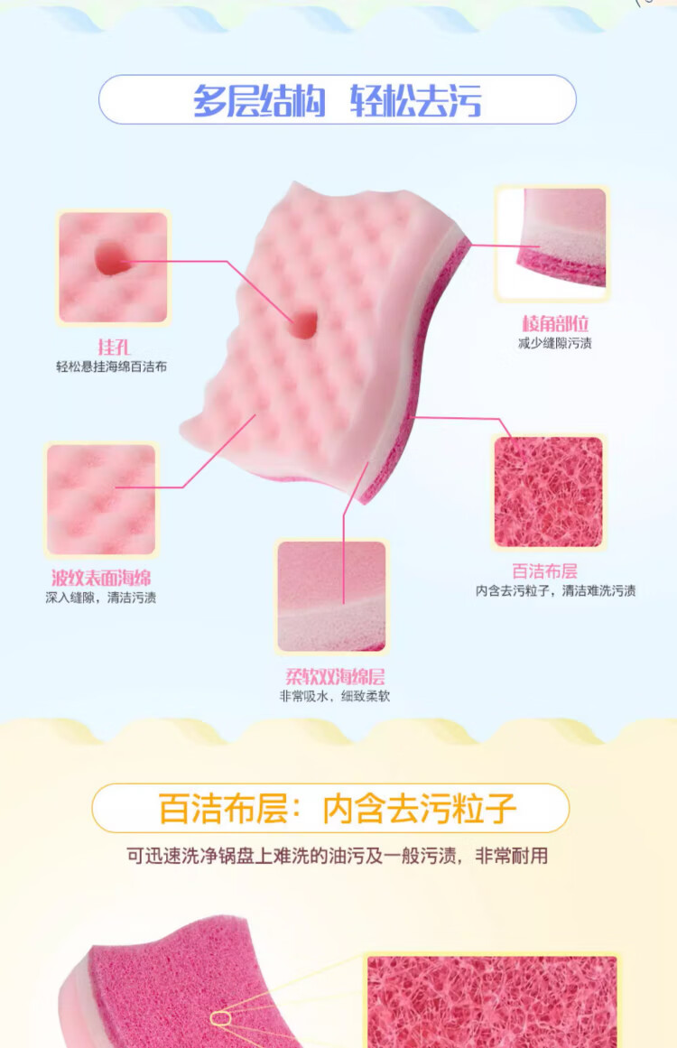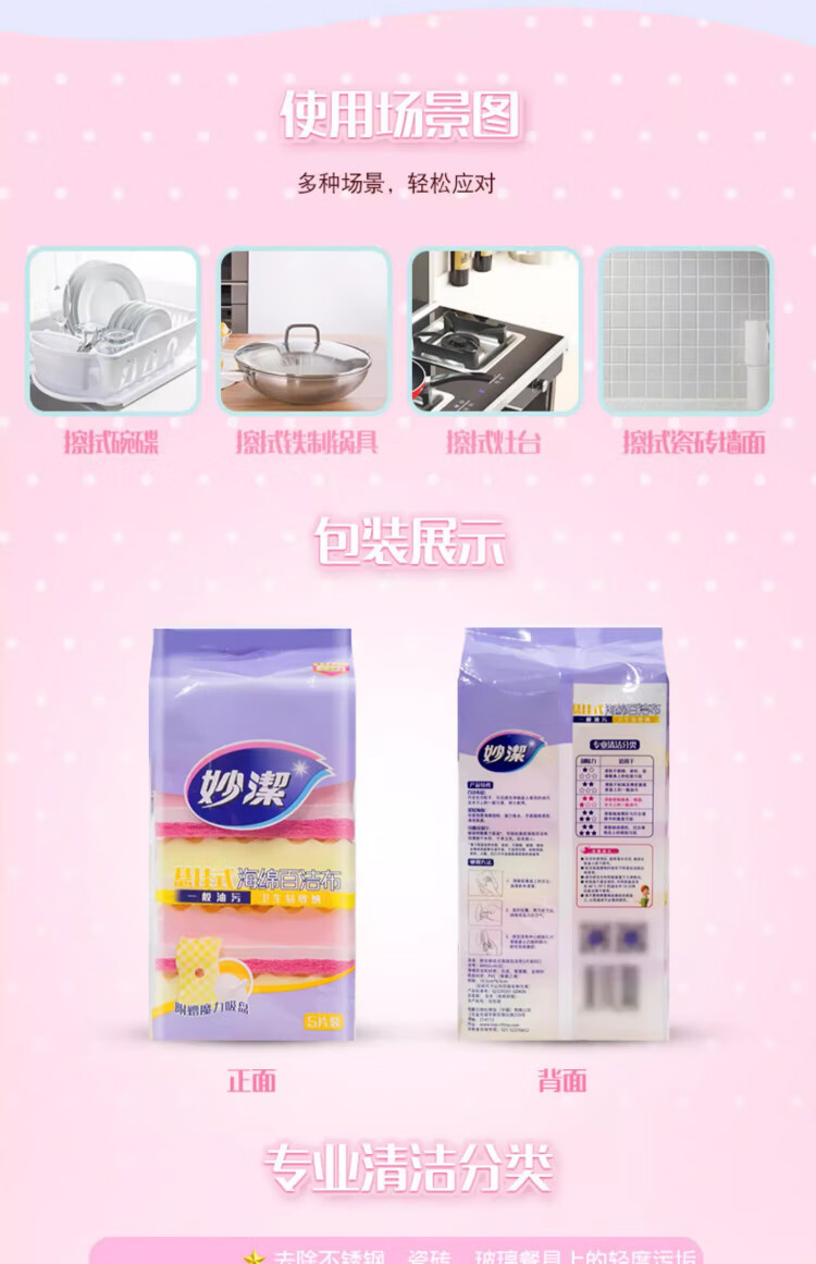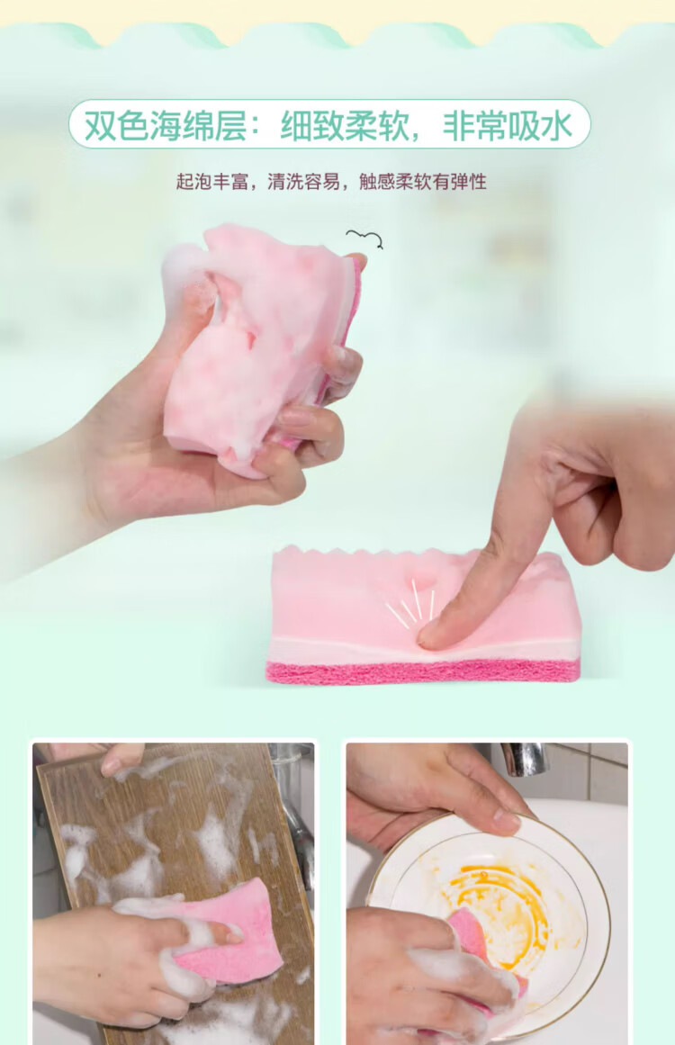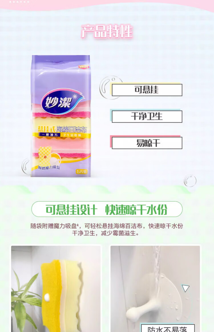 Miaojie sponge scouring pad, easy to absorb water, kitchen degreasing dishwashing cotton, hanging type 5 pieces, with hanging suction cup, 2 bags