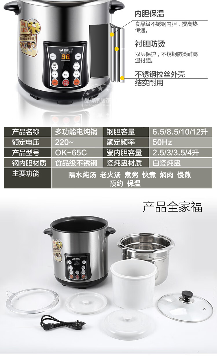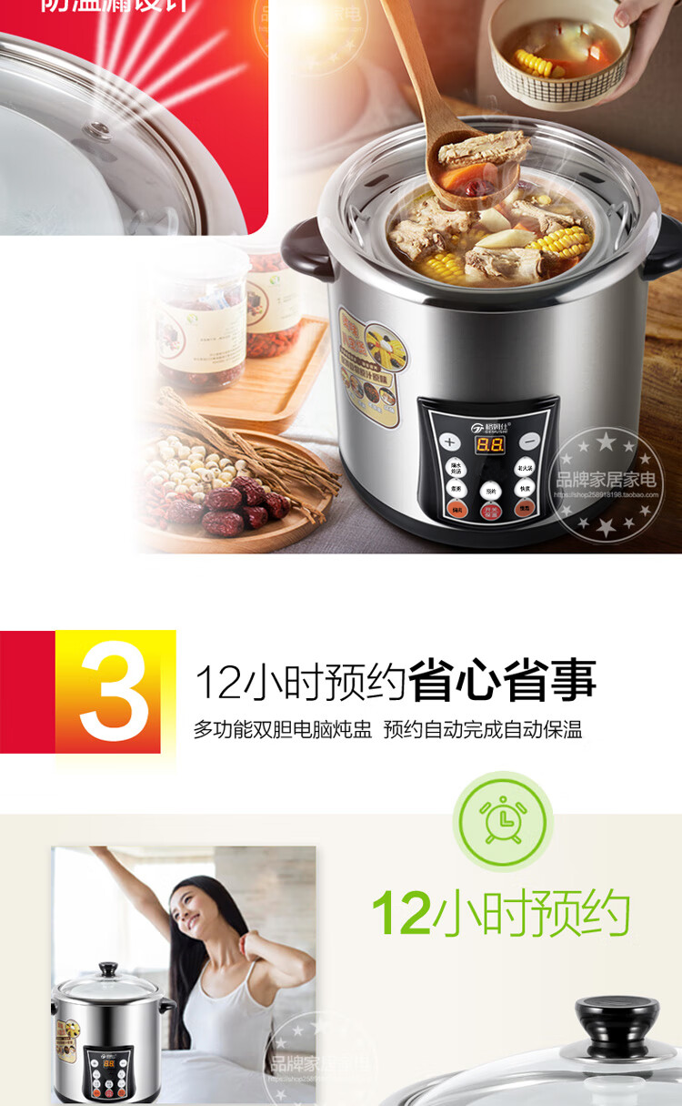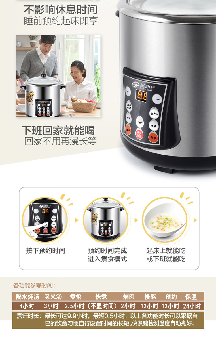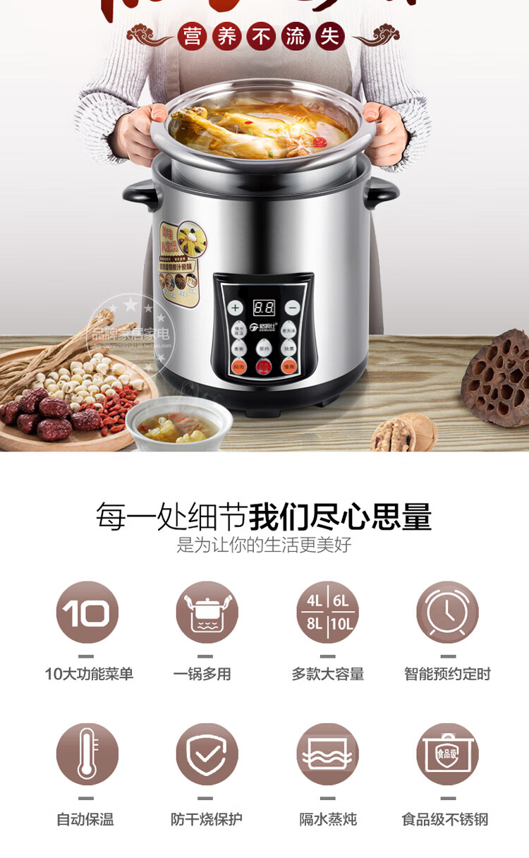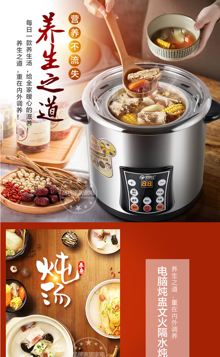 Gemus stainless steel electric stew pot, fully automatic household soup pot, water-proof stew pot, large capacity 10 liters, commercial multi-functional porridge pot, lemon paste stew, scheduled timer, heat preservation and health-preserving soup pot, 6.5L double bladder (2.5L stew pot), household use for 3-5 people, 6.5L