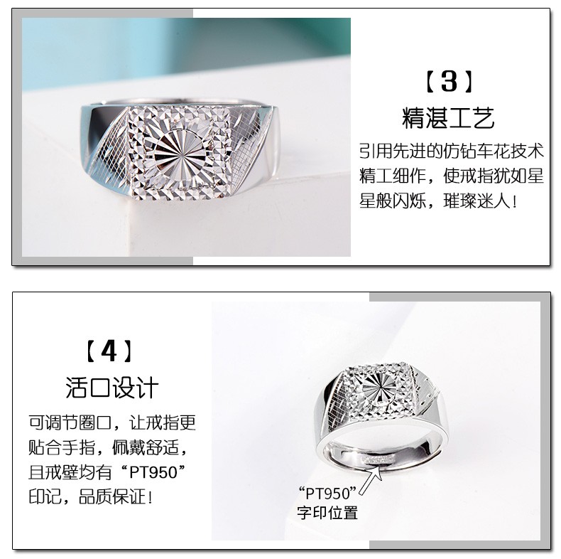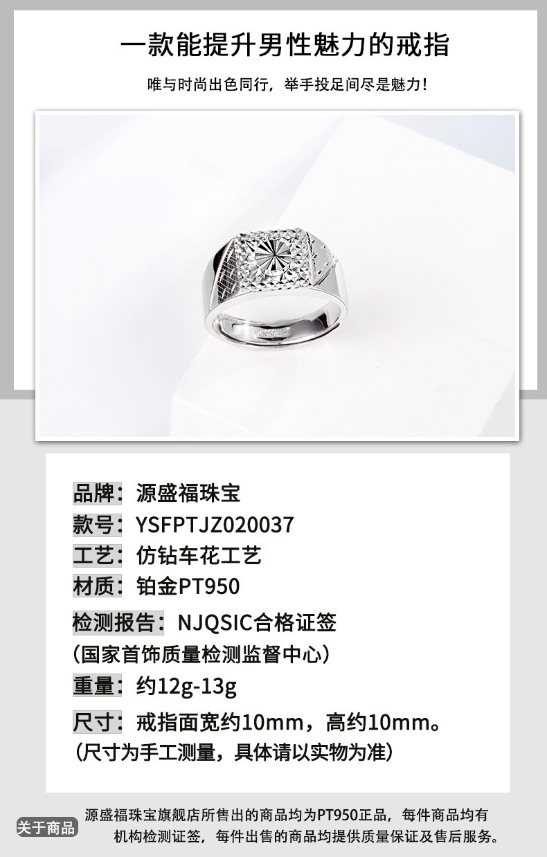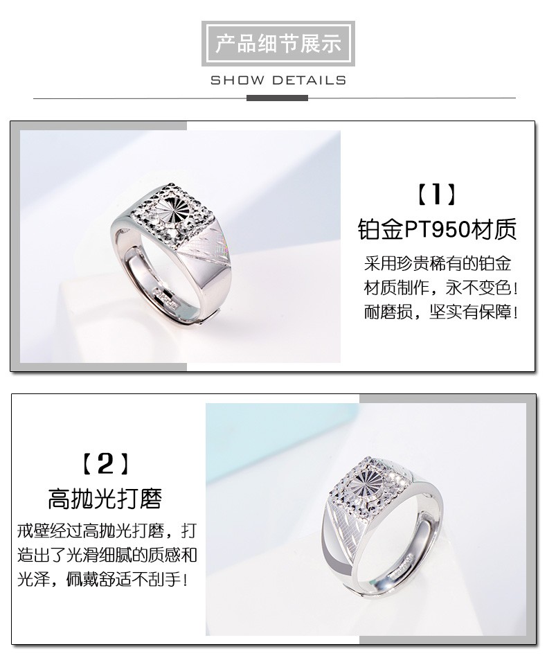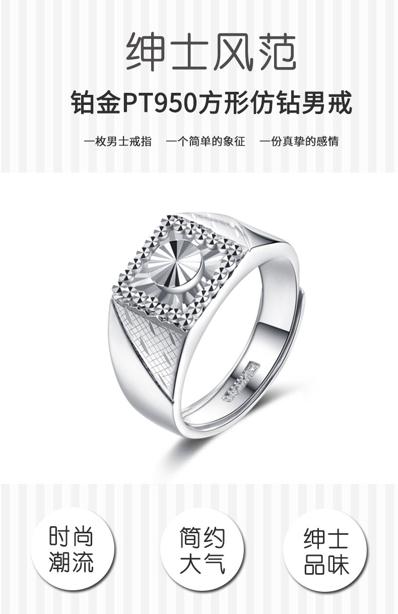 Yuan Shengfu's new PT950 square imitation diamond platinum ring, fashionable men's platinum ring, adjustable promotion, 13.23 grams