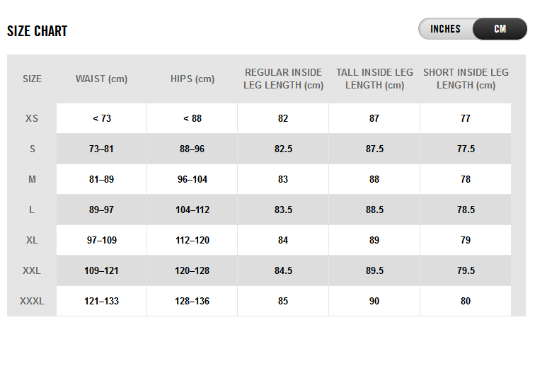 Outseam (cm) 99 cm 101.5 cm 104 cm 106.5 cm 109 cm