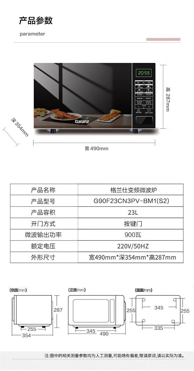 Galanz National Subsidy Variable Frequency Microwave Oven All-in-One Light Wave Oven 900 Watt High Power Fast Heating Home Large Tablet 23L Large Capacity Power Saving Level 1 Energy Efficiency BM1(S2)