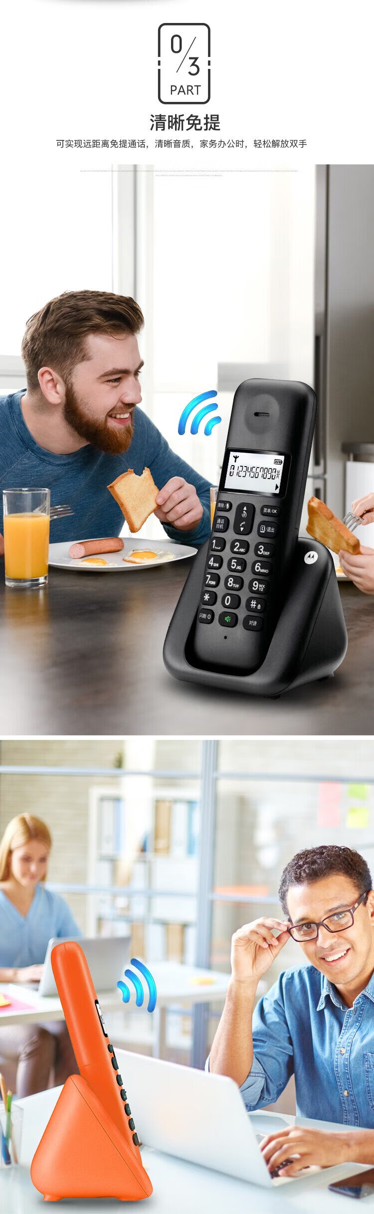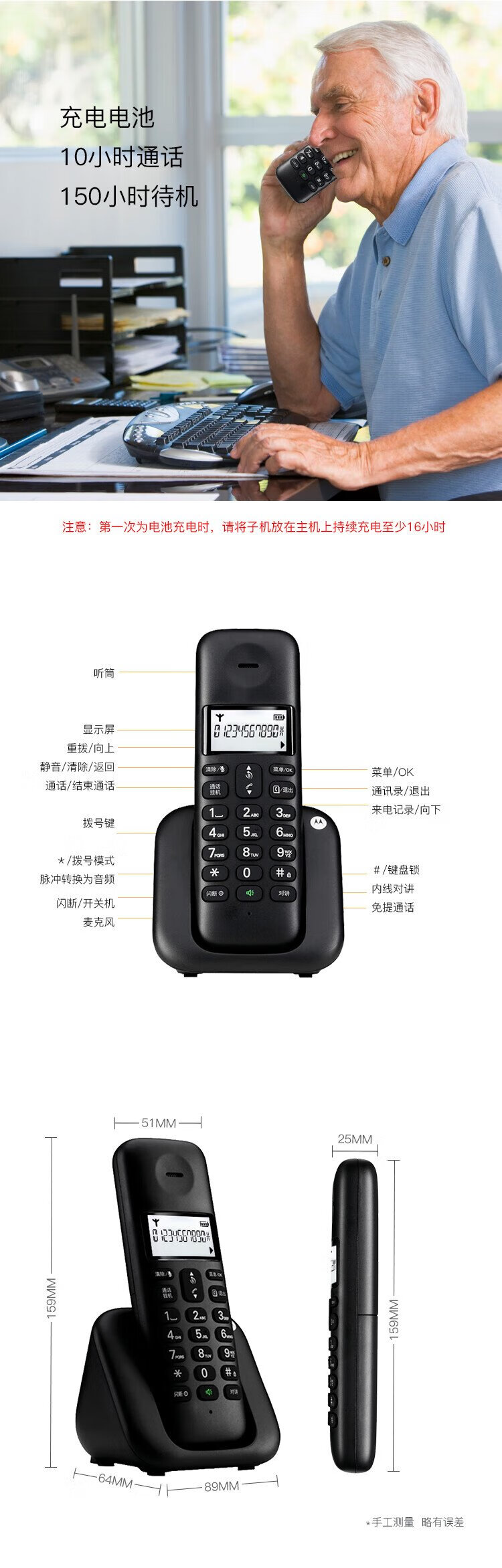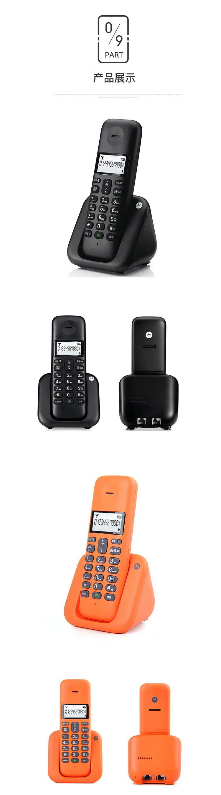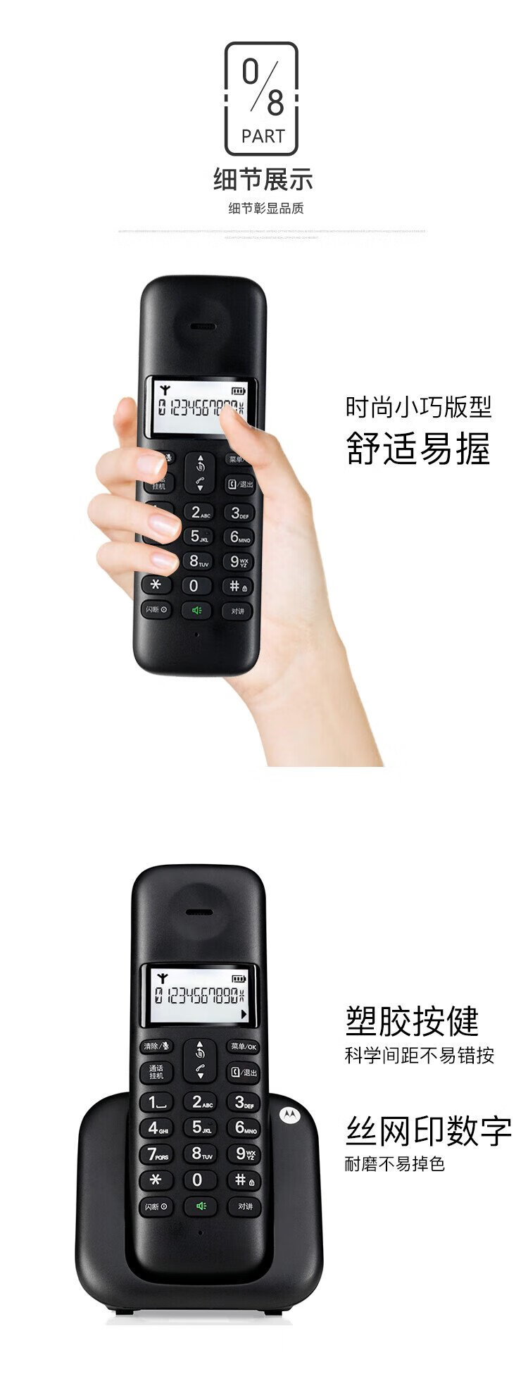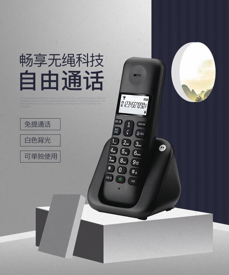 Motorola digital cordless telephone, wireless landline, stand-alone phone, set, large screen, white backlight, clear hands-free, office and home use T301C (black)