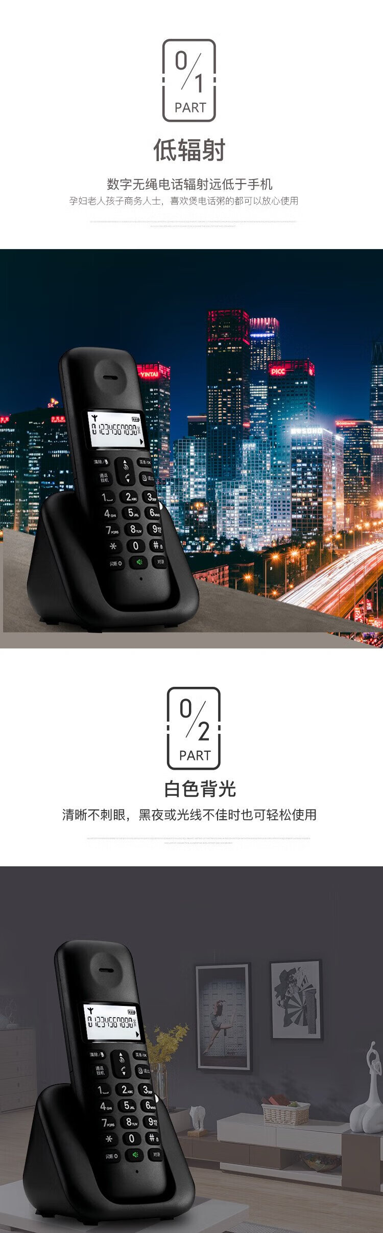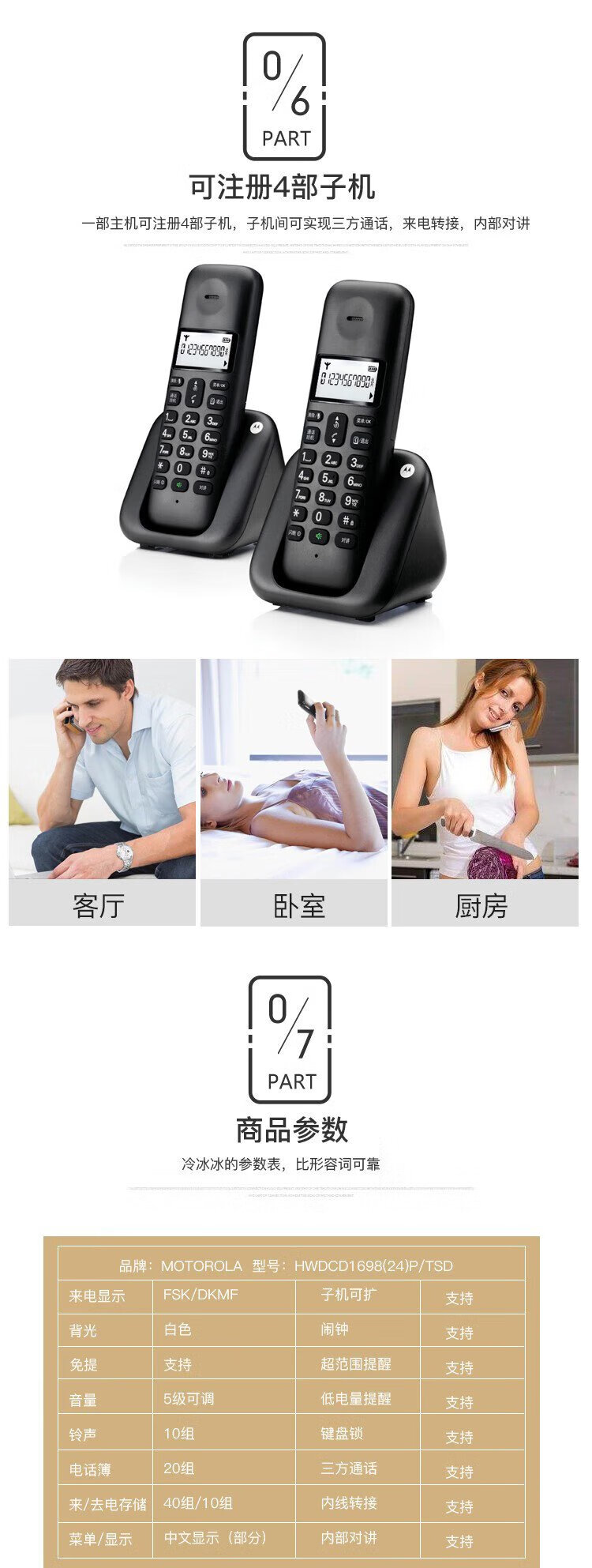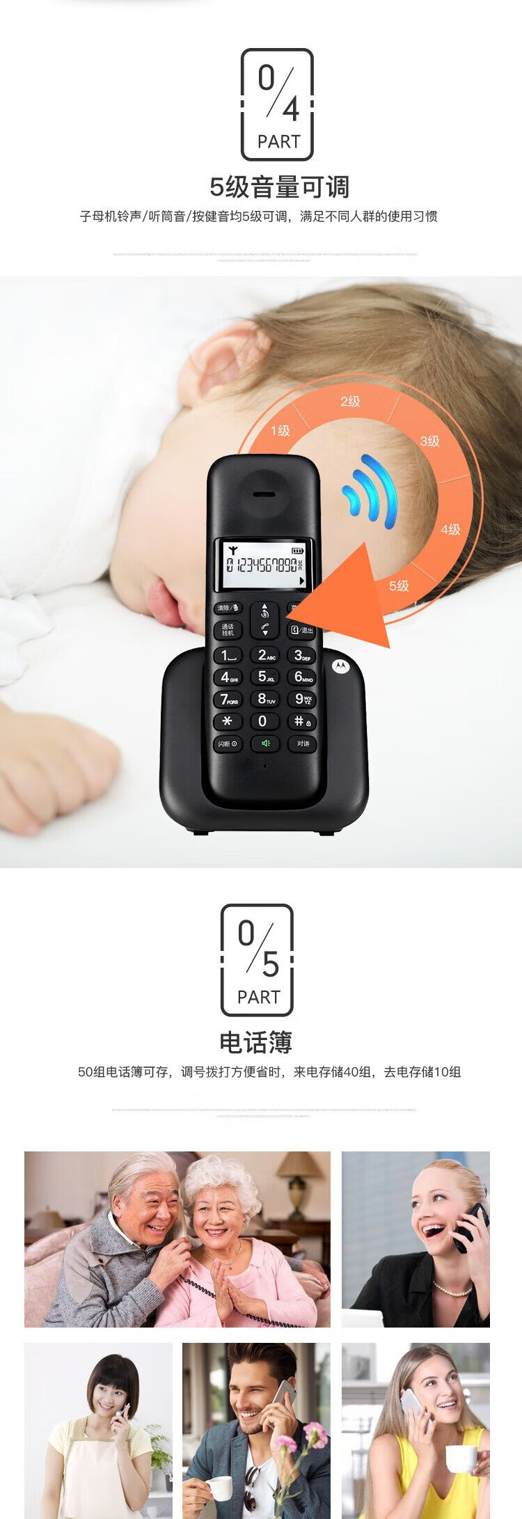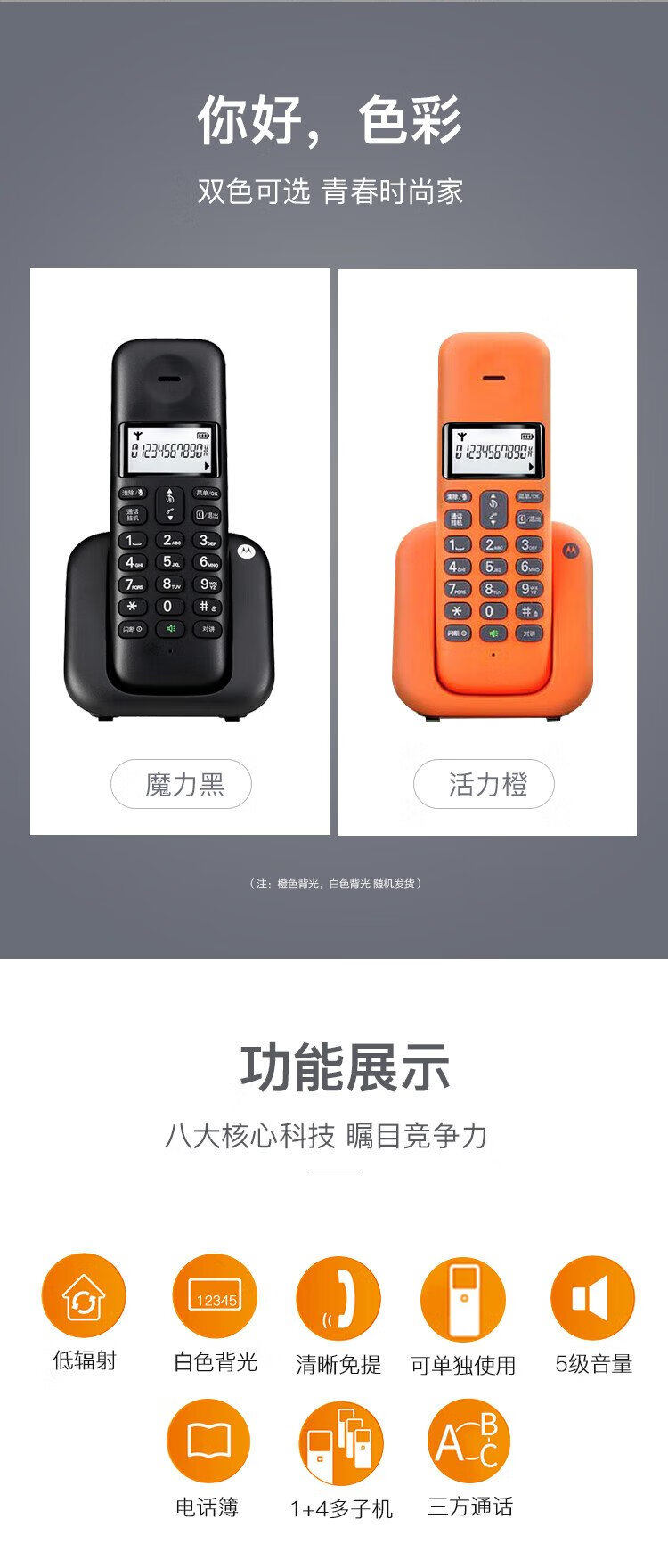 Motorola digital cordless telephone, wireless landline, stand-alone phone, set, large screen, white backlight, clear hands-free, office and home use T301C (black)