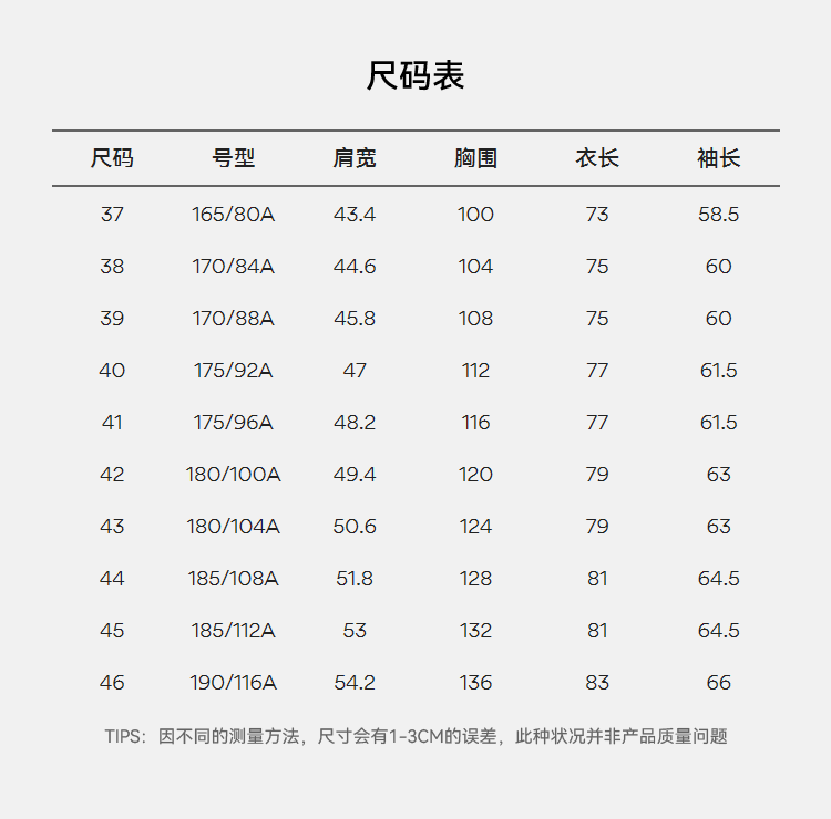 China (cm) 160-165/84-86 165-170 / 88-90 167-172 / 92-96 168-173 / 98-102 170-176 / 106-110