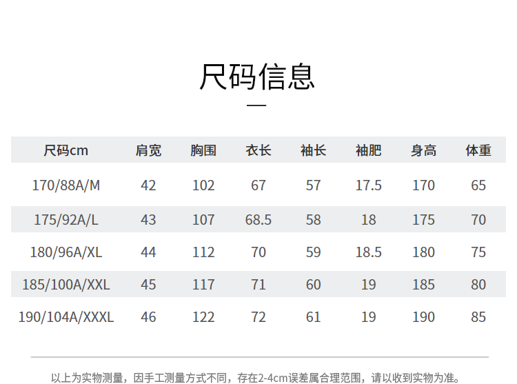 China (cm) 165 / 88-90 170 / 96-98 175 / 108-110 180 / 118-122 185 / 126-130