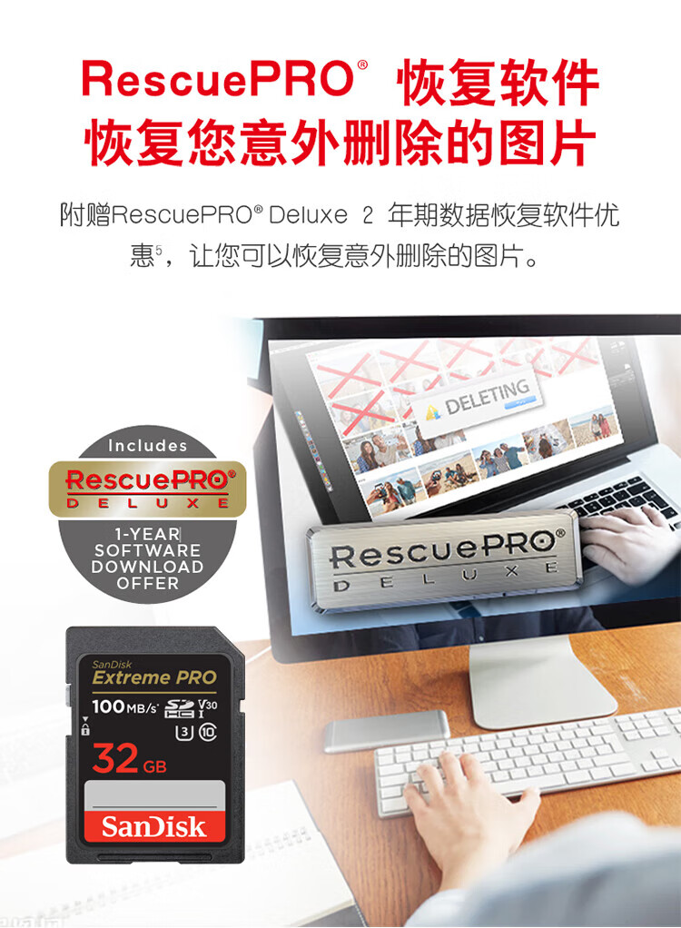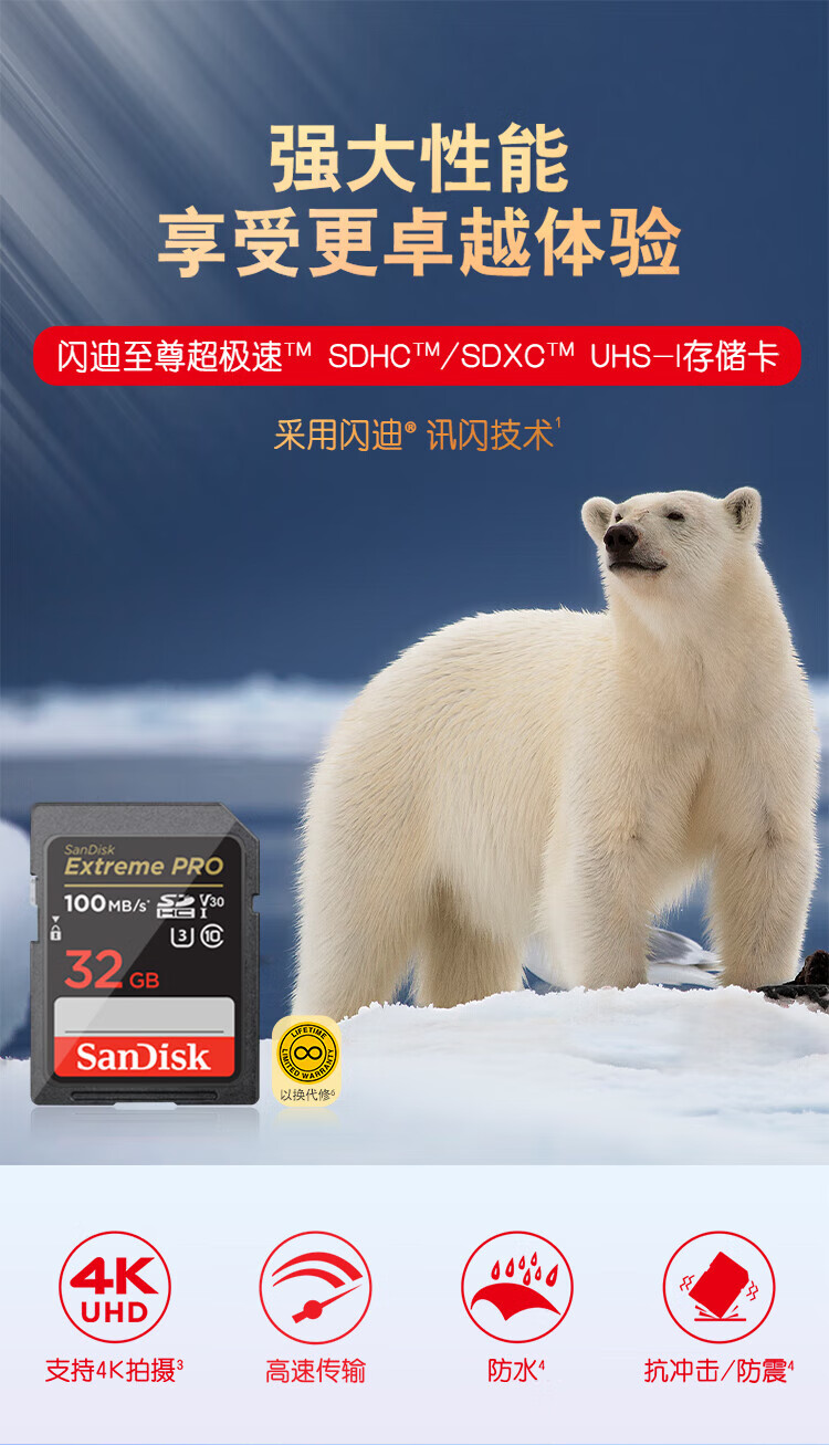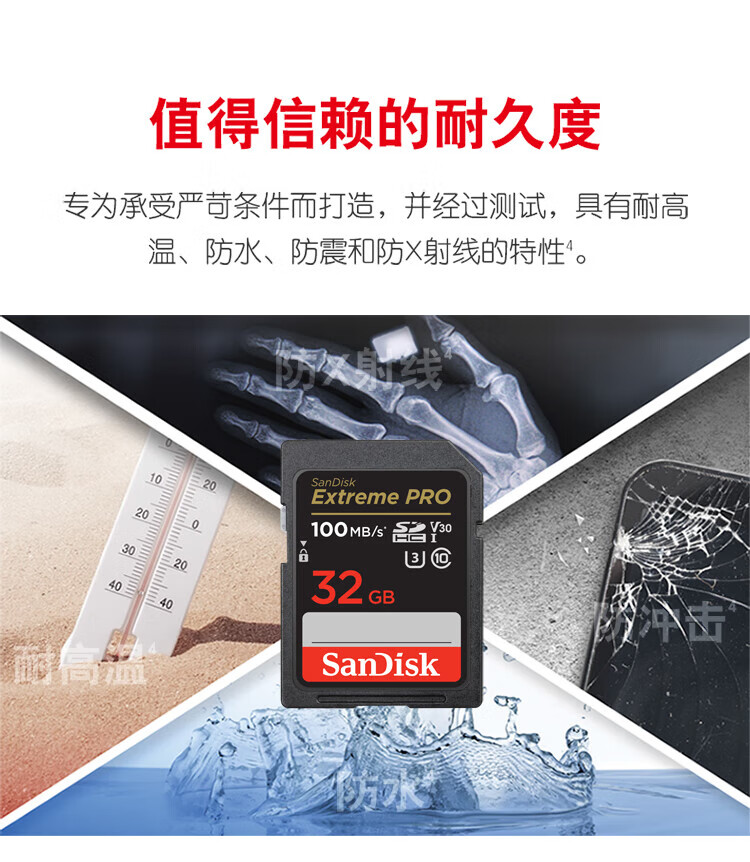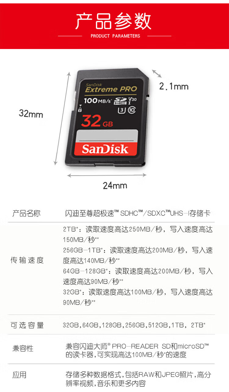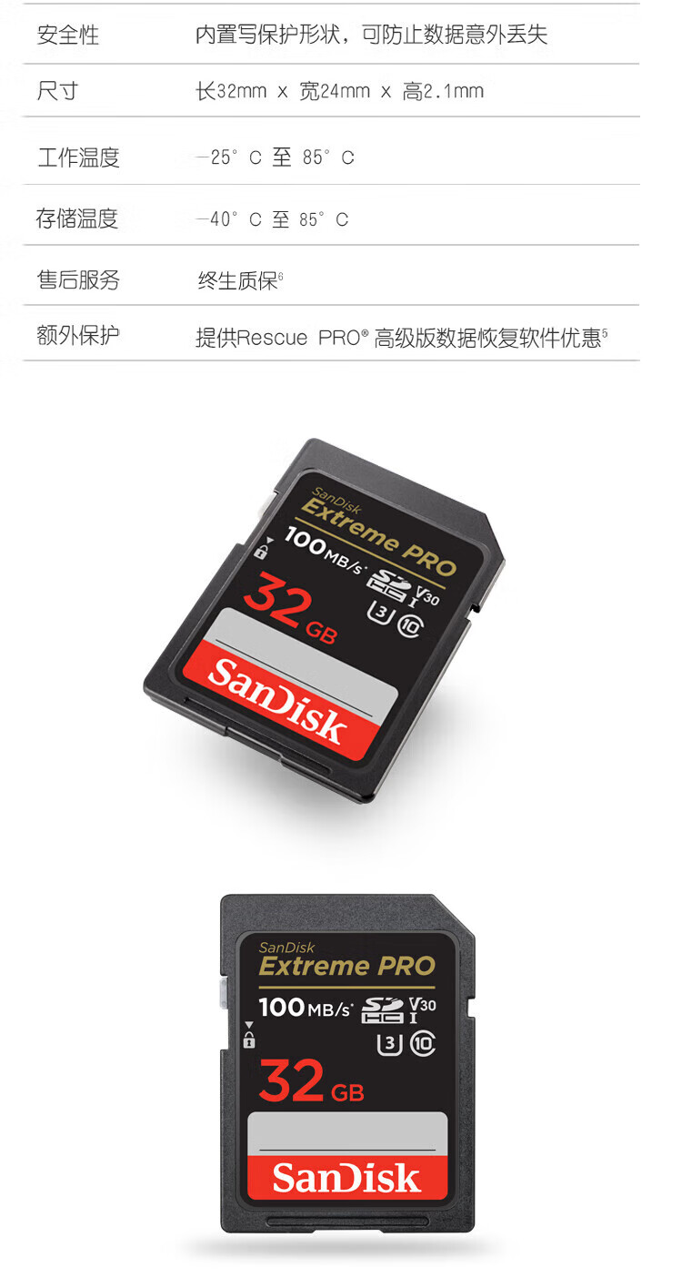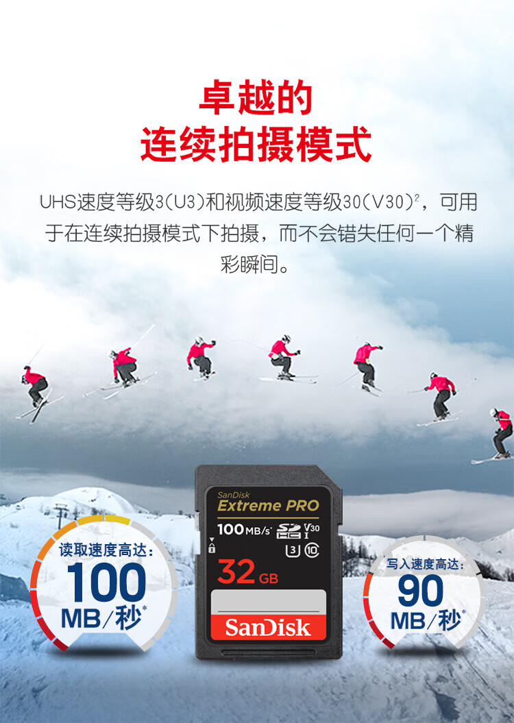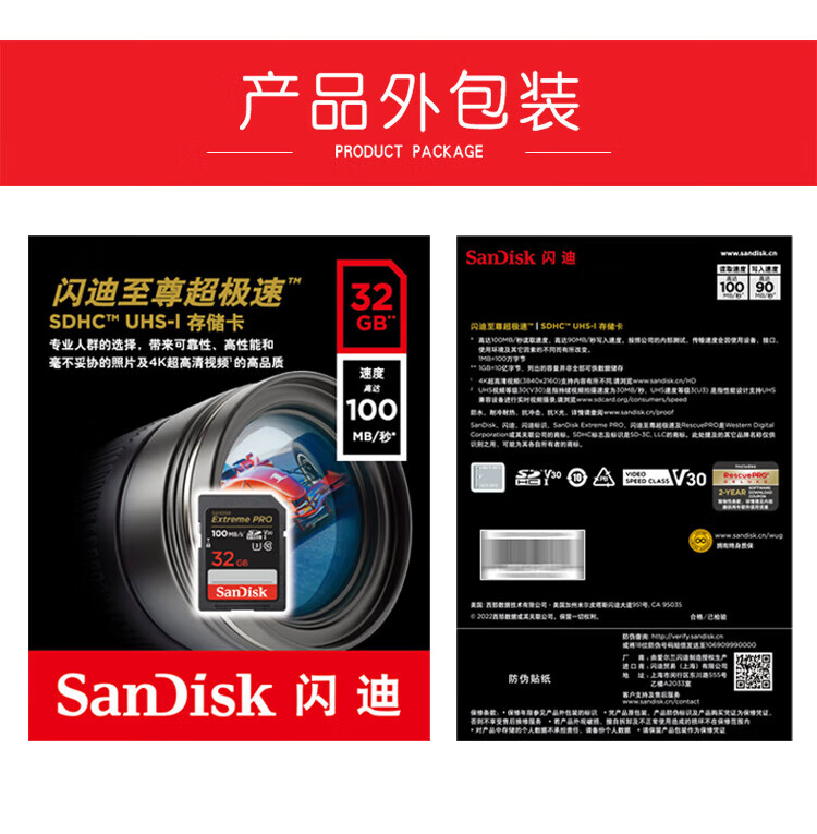SanDisk 32GB SD memory card 4K V30 U3 C10 camera memory card reading speed 100MB/s writing speed 90MB/s mirrorless/SLR camera memory card