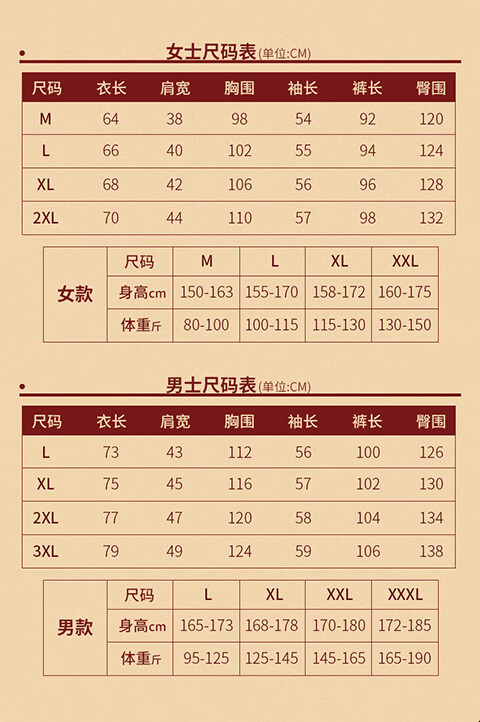 China (cm) 160-165/84-86 165-170 / 88-90 167-172 / 92-96 168-173 / 98-102 170-176 / 106-110