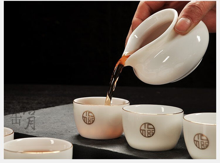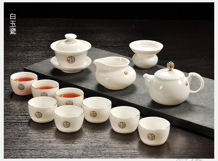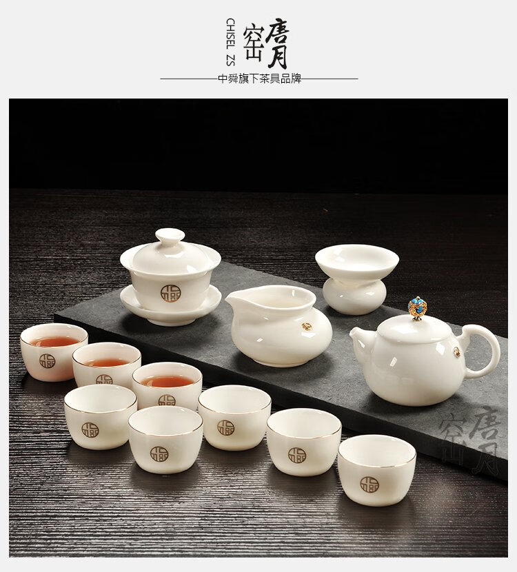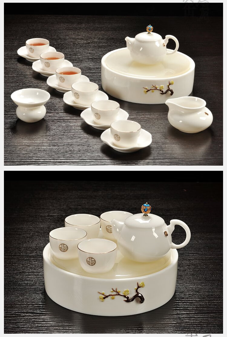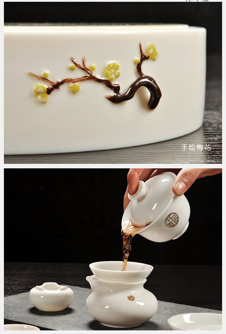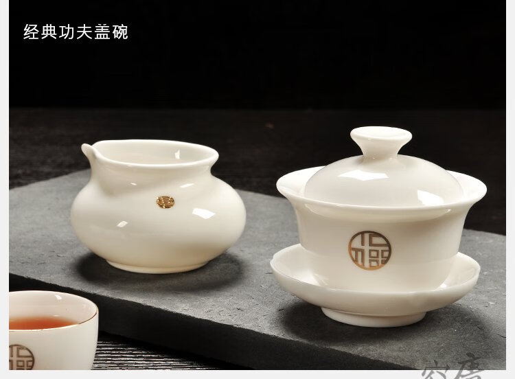Greek-style mutton-fat jade porcelain Kung Fu tea set for home use Tangyue kiln Dehua white jade porcelain tea set office cover bowl tea cup small tea tray set jade tea table dry infusion tray gift box Horseshoe jade porcelain 7 pieces (gift box)