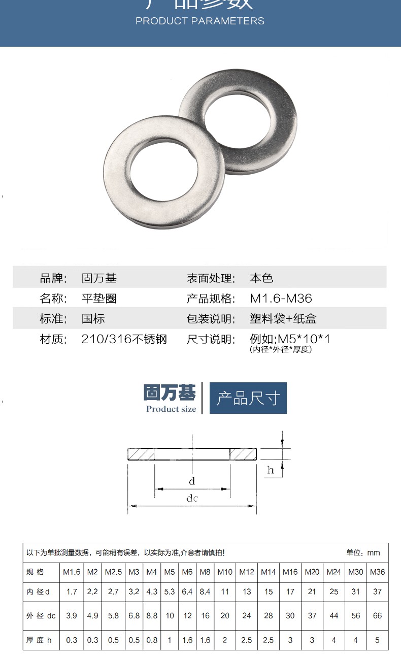Guwanji 316 stainless steel flat washer 304 ultra-thin round washer enlarged flat washer metal flat washer washer thickened meson M6*12*1.5 50 pieces -316 material