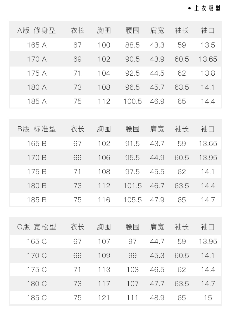 China (cm) 160-165/84-86 165-170 / 88-90 167-172 / 92-96 168-173 / 98-102 170-176 / 106-110