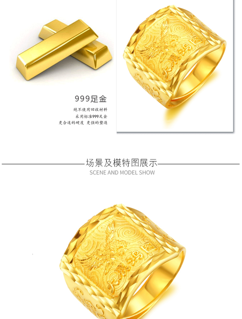 Xiyuanxiang Jewelry Pure Gold 999 Grand Exhibition Gold Ring Luxurious and Domineering Men's Live Gold Ring Birthday Gift Gold Weight 14.69g