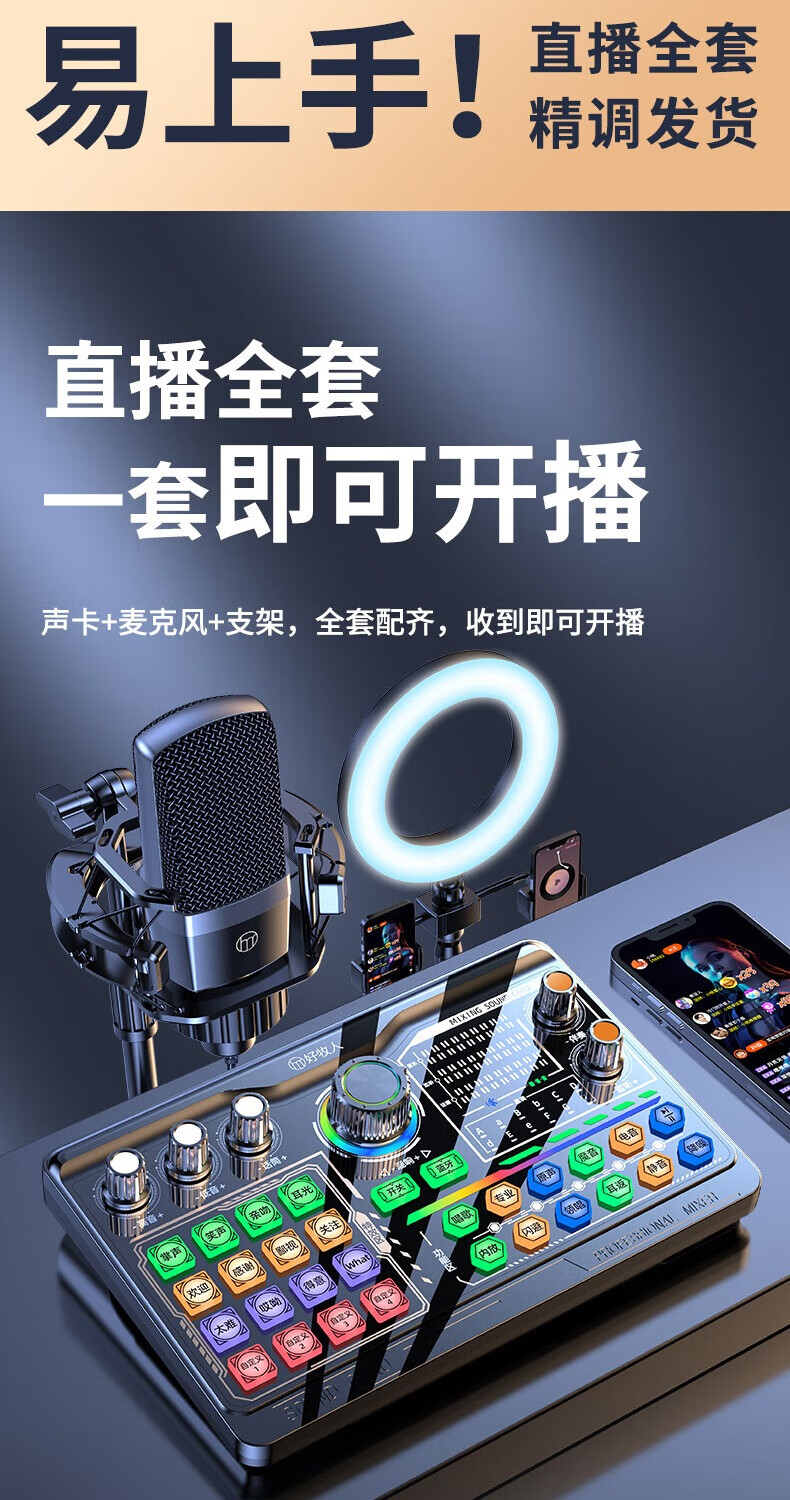 Good Shepherd Sound Card Live Broadcast Equipment Set Singing Special Microphone Douyin National K-Sing Full Set Microphone Fill Light Mobile Phone Outdoor Computer Recording Professional Live Broadcast Voice Changer Flagship Edition - Black Sound Card Complete Set + Diaphragm Microphone - (Disc Mobile Phone Holder)