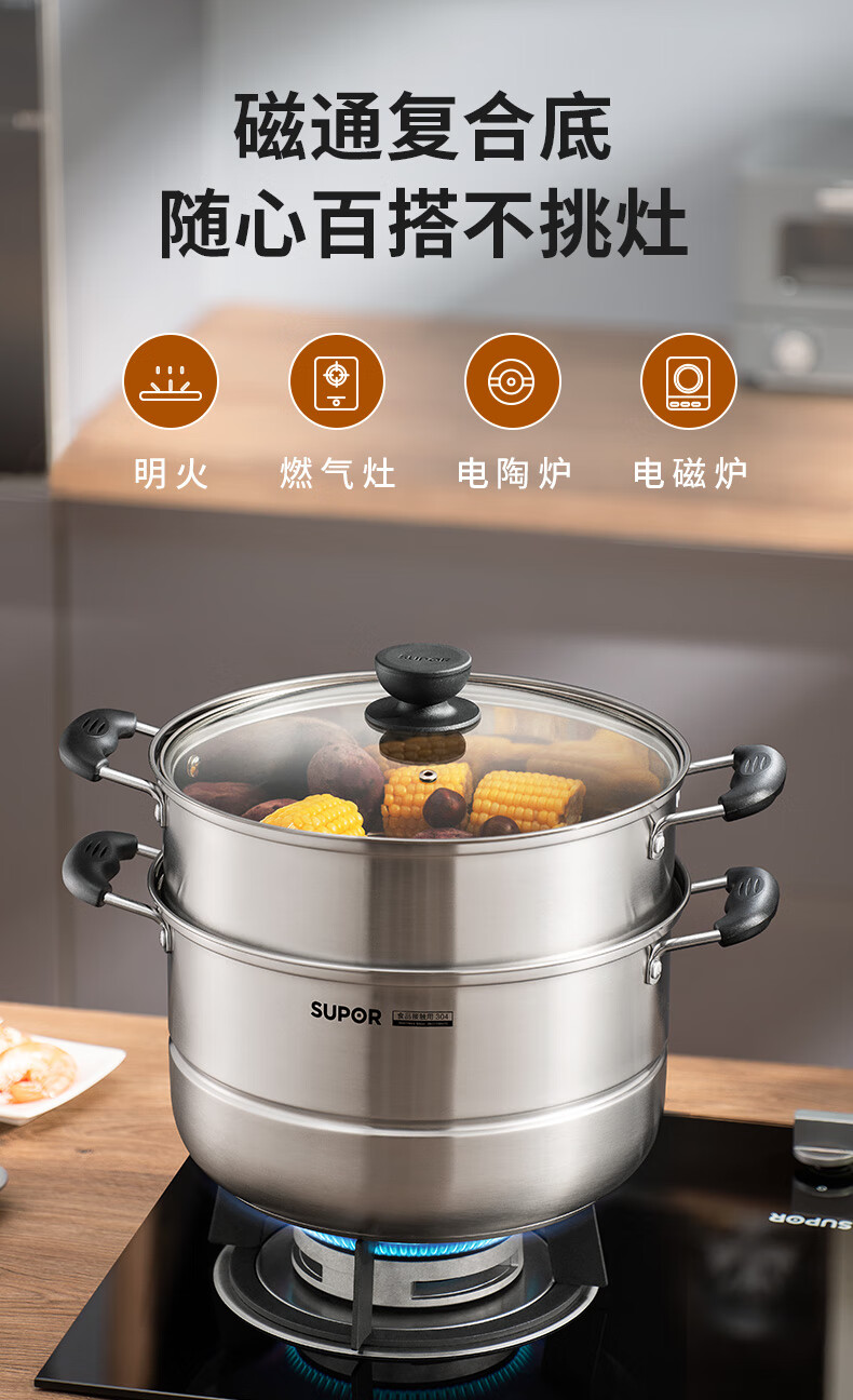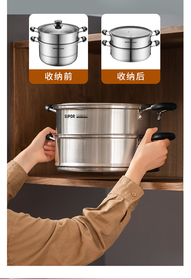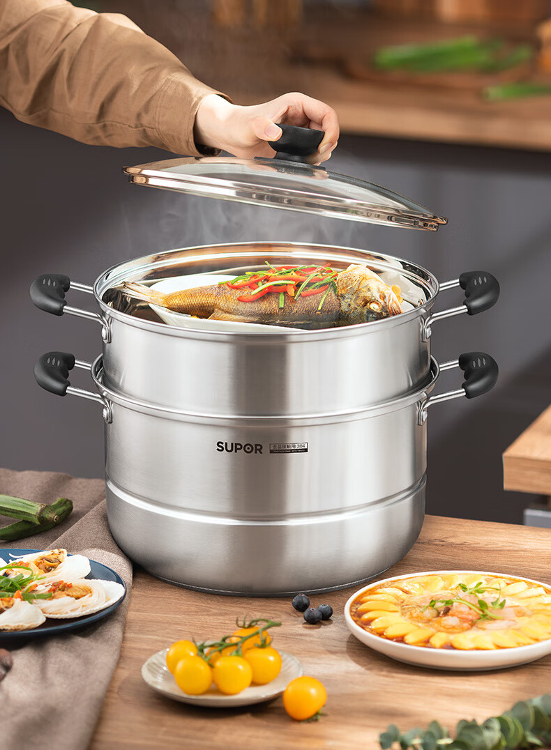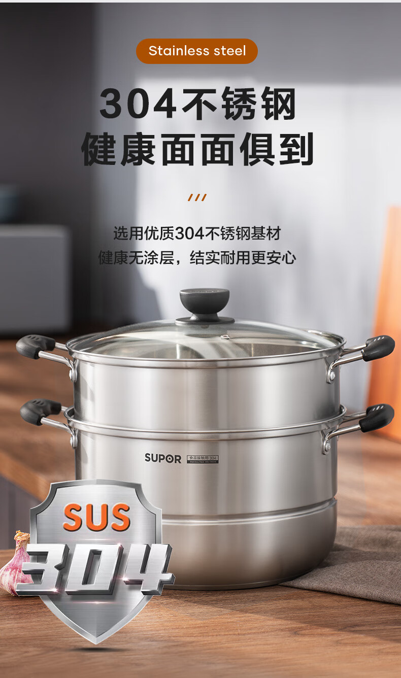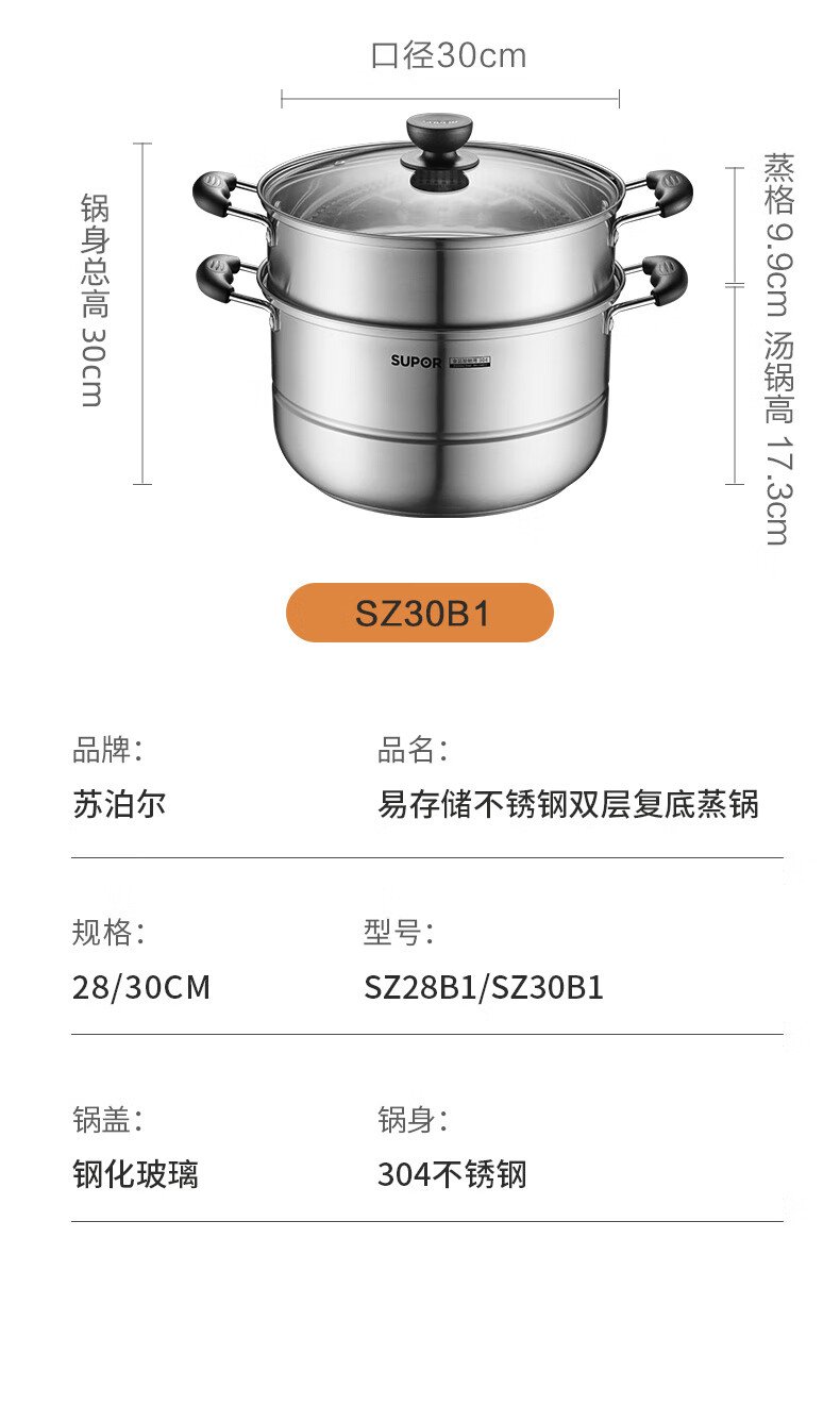 苏泊尔SUPOR易存储304不锈钢双层复底30cm蒸锅汤锅蒸笼SZ30B1