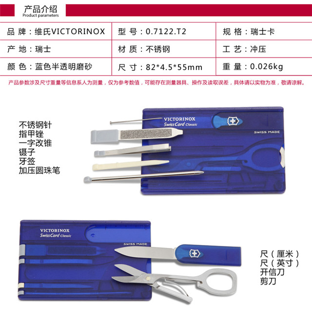 Victorinox Swiss Army Knife 10 Functions Fruit Knife Multi-Function Knife Folding Knife Classic Swiss Card Blue 0.7122.T2