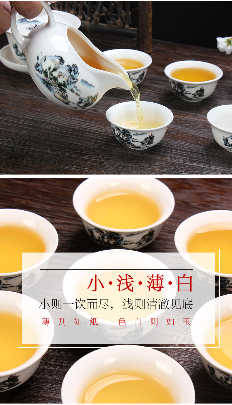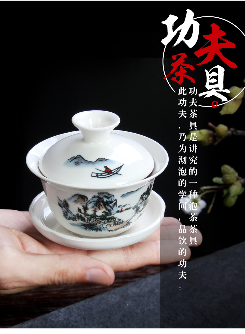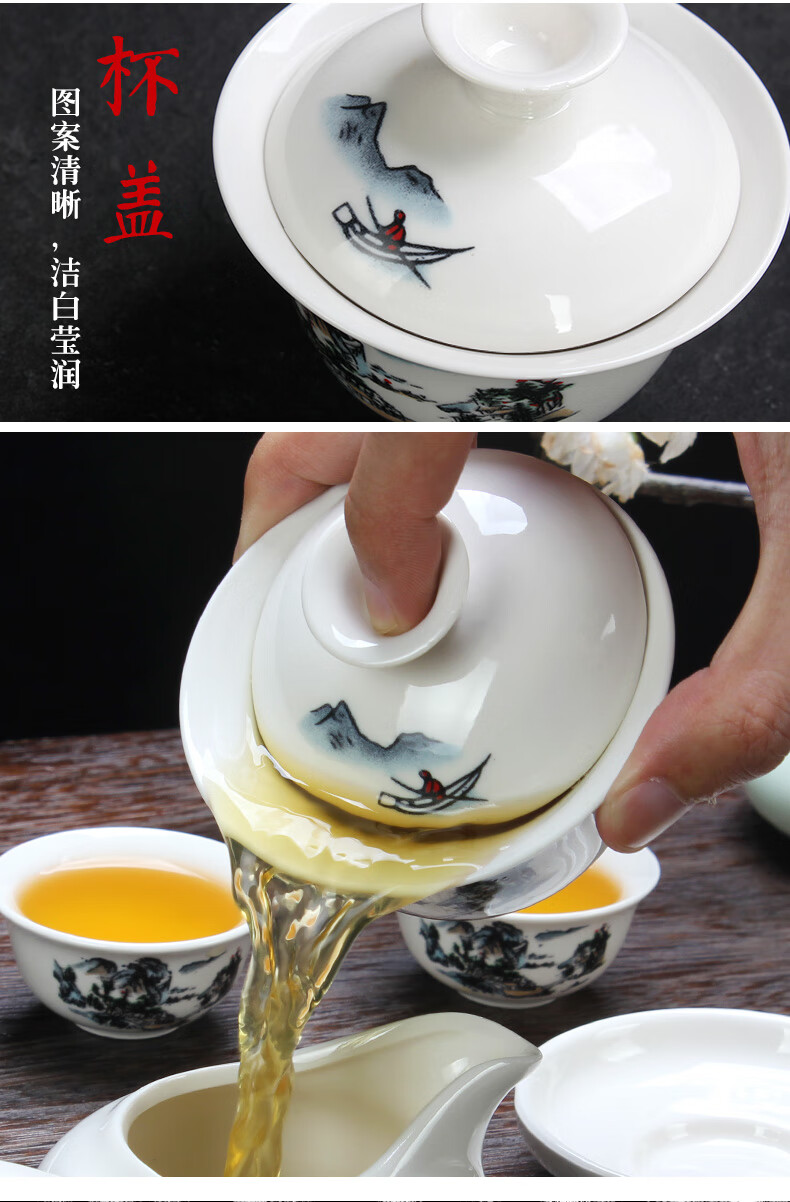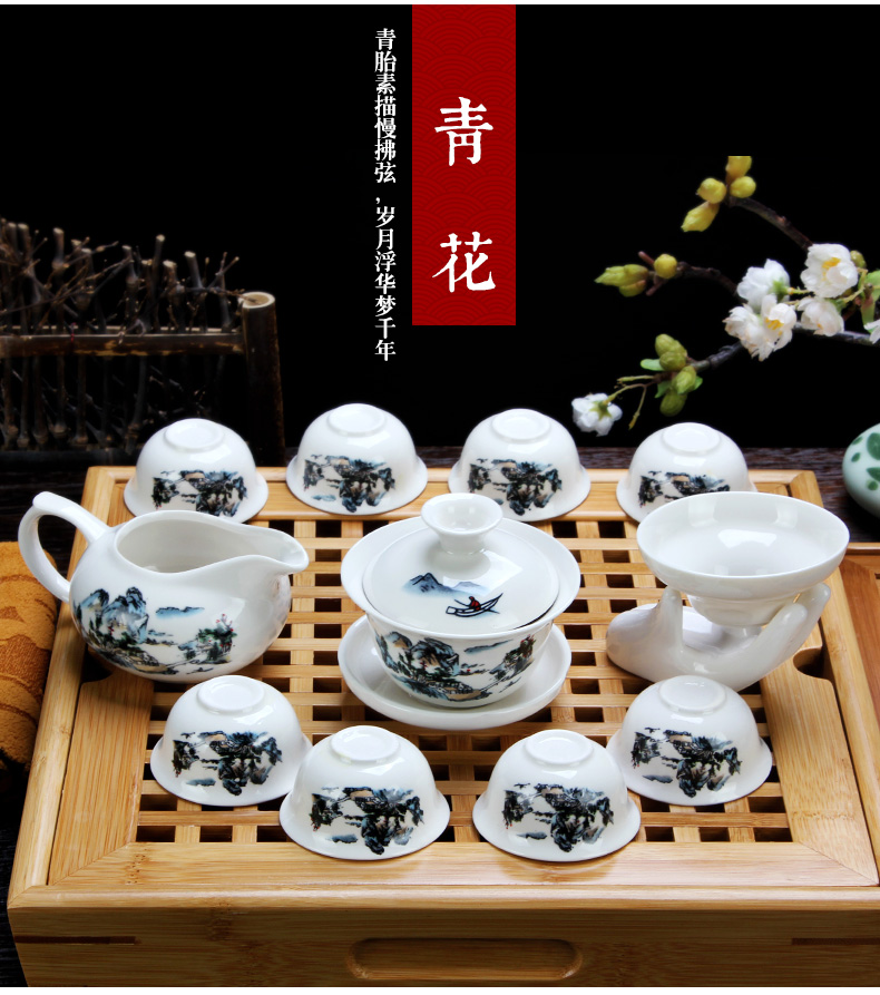Ceramic Kung Fu tea set, home white porcelain tea set, office reception, blue and white teapot, lidded bowl, tea cup, complete tea set, 12-head Kung Fu tea set, Blue Landscape