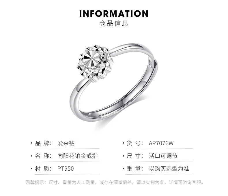 Aido Diamond pt950 platinum ring, fashionable platinum sunflower ring, adjustable gift for girlfriend, weight 2.6-2.8 grams + delivery certificate