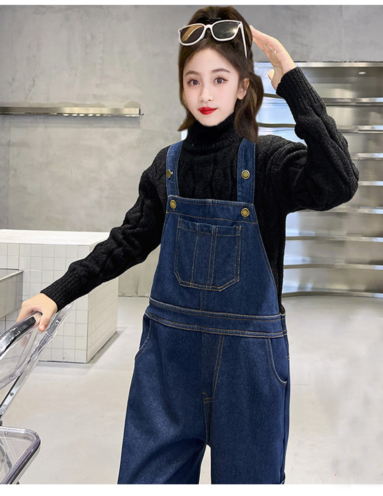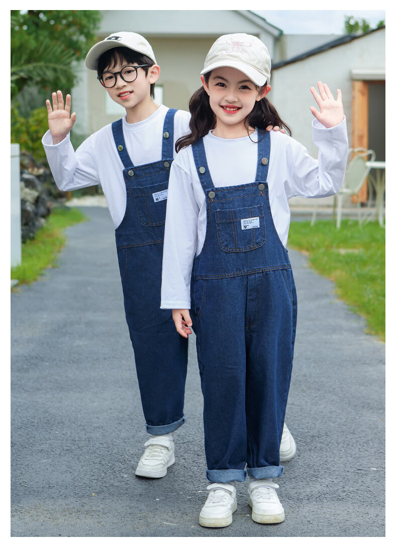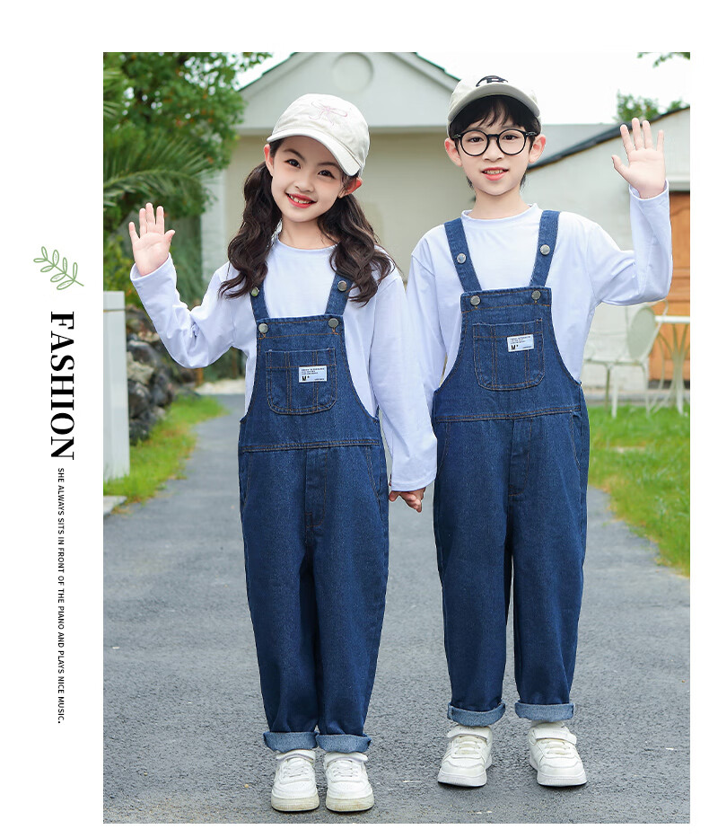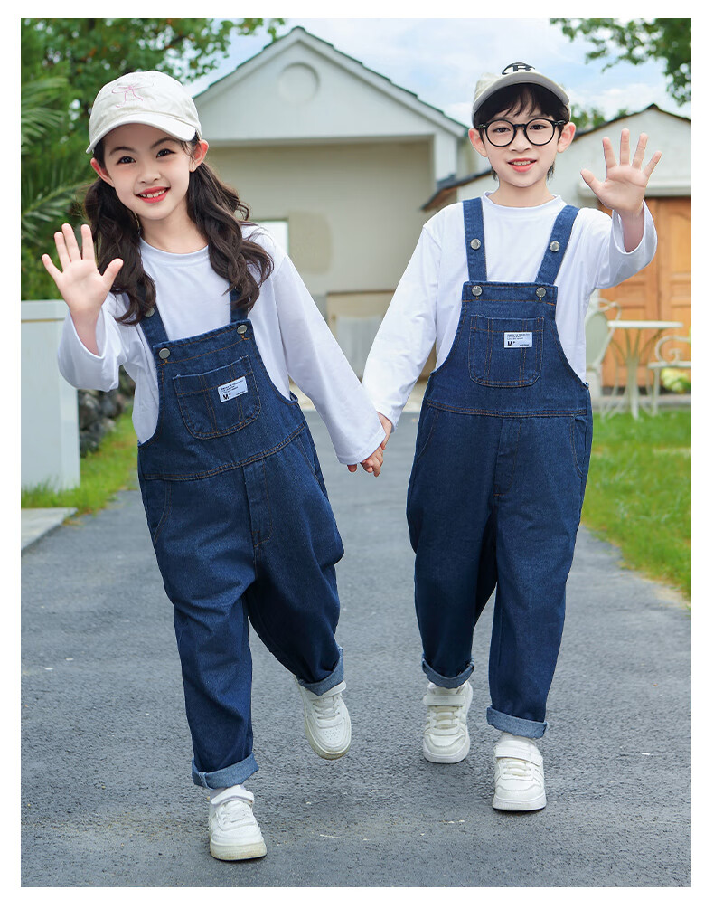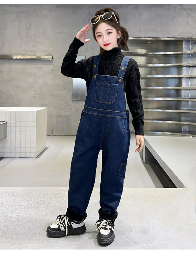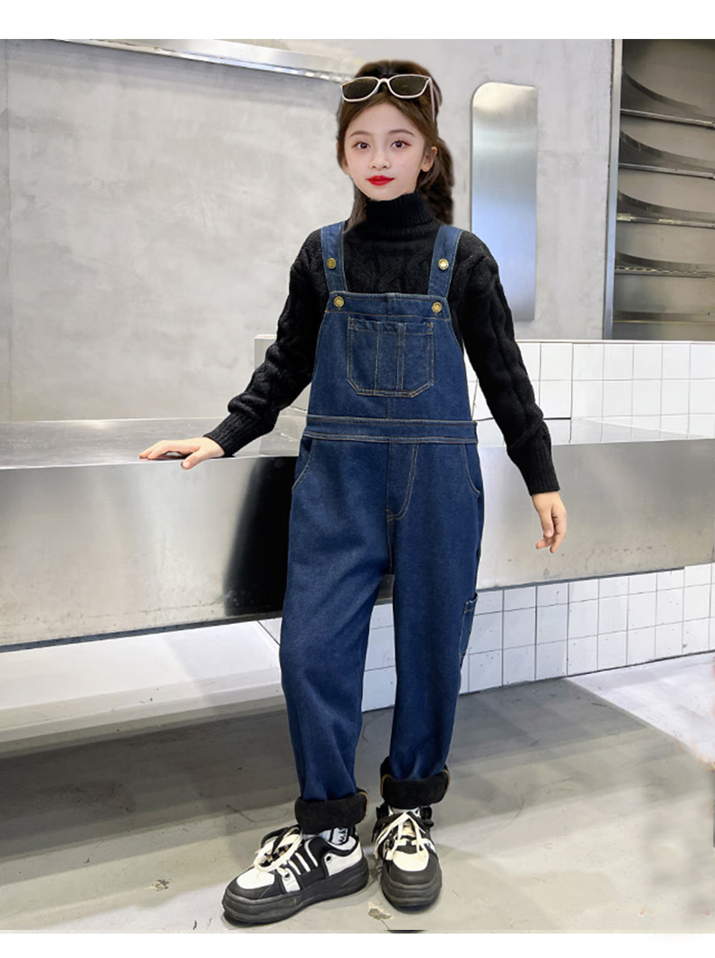 Sichuan boys and girls same style denim overalls 2025 spring, autumn and winter plus velvet jeans medium and large children's loose overalls half size too small blue five pockets 150cm