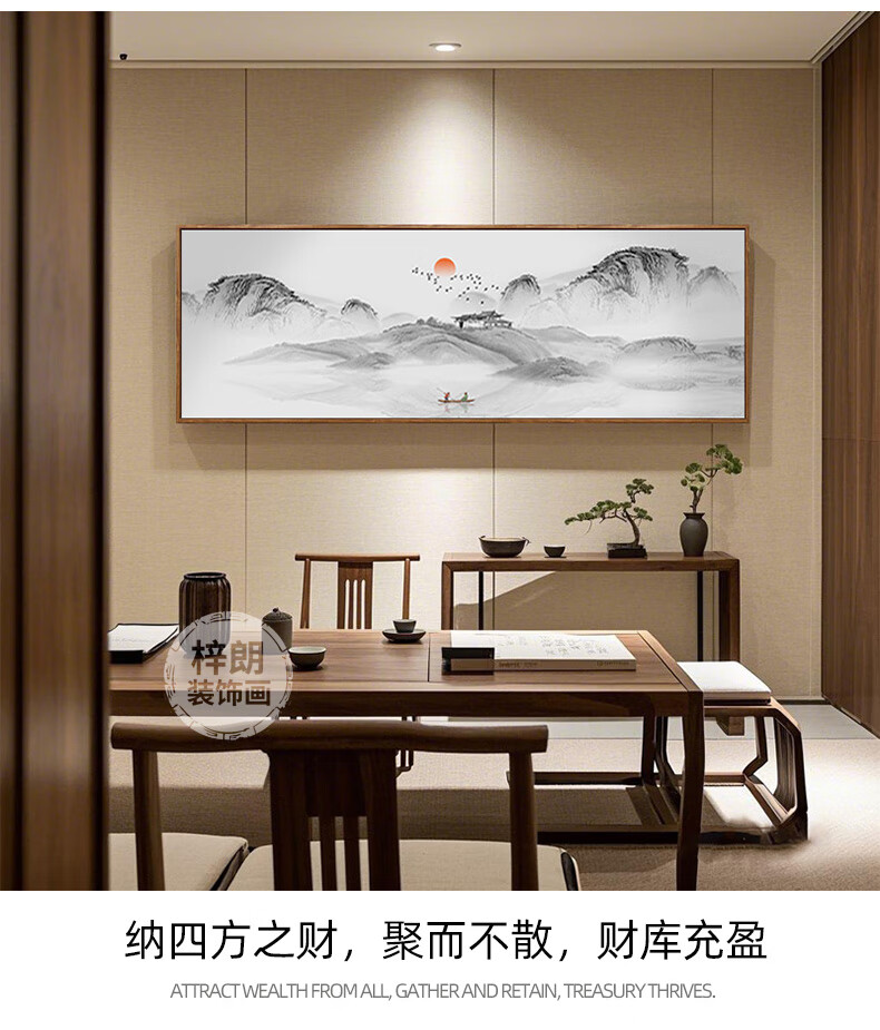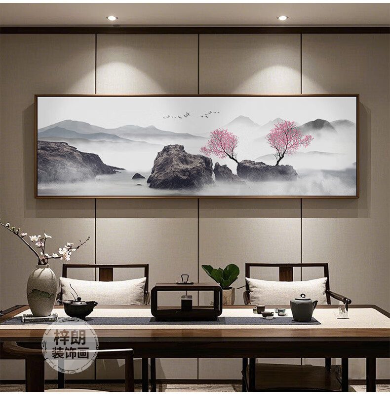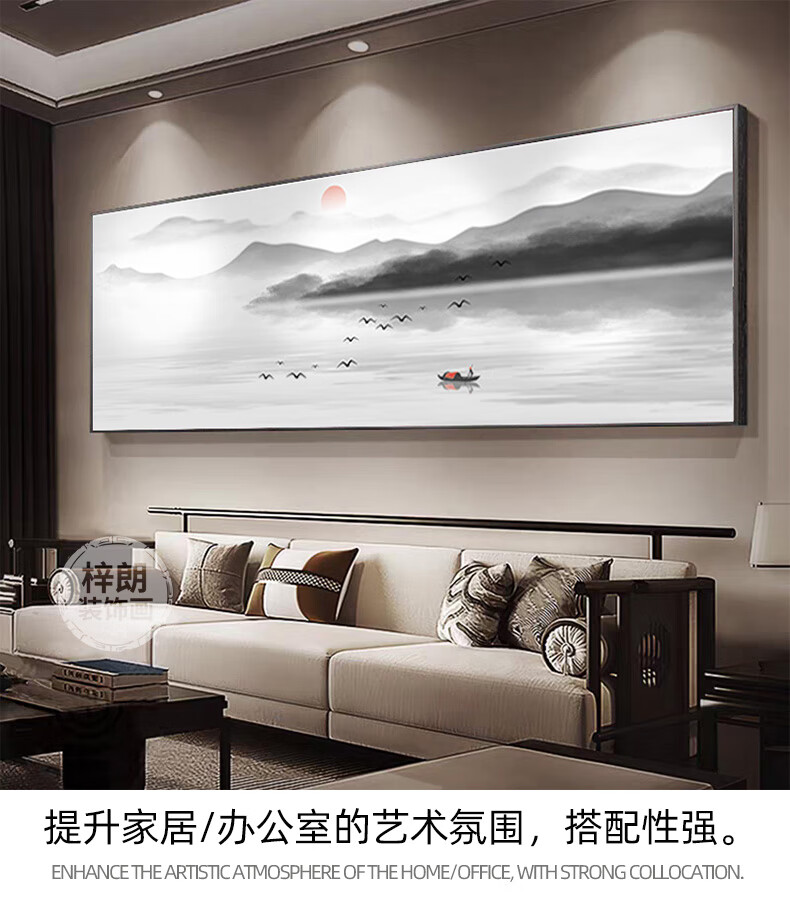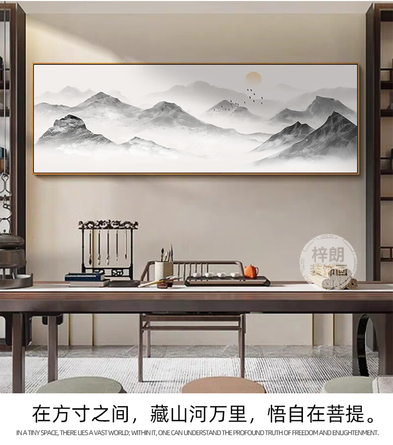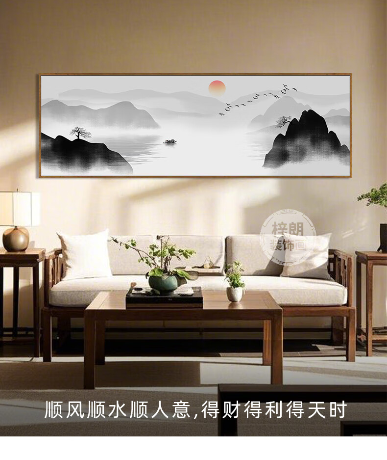 Zilang living room decorative painting sofa background wall ink Zen landscape painting wall hanging painting tea room office calligraphy and painting mural 04-with backing 50*150CM wood grain yellow frame + canvas SF Express