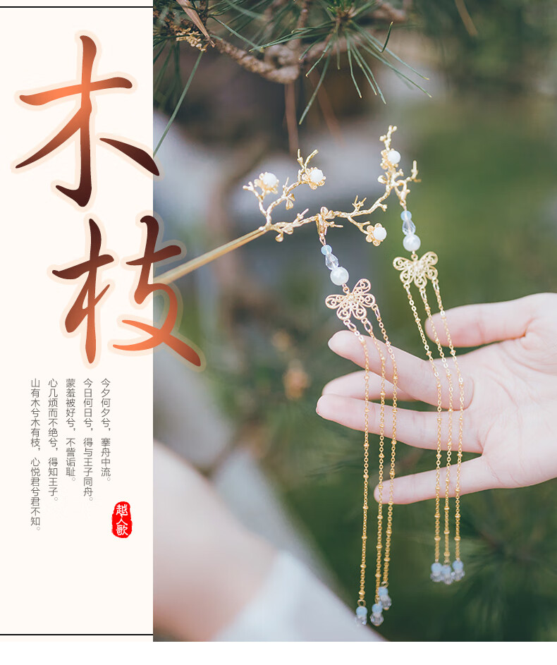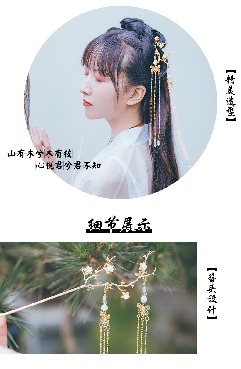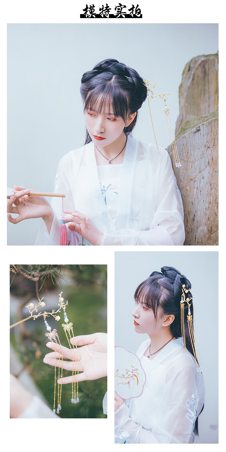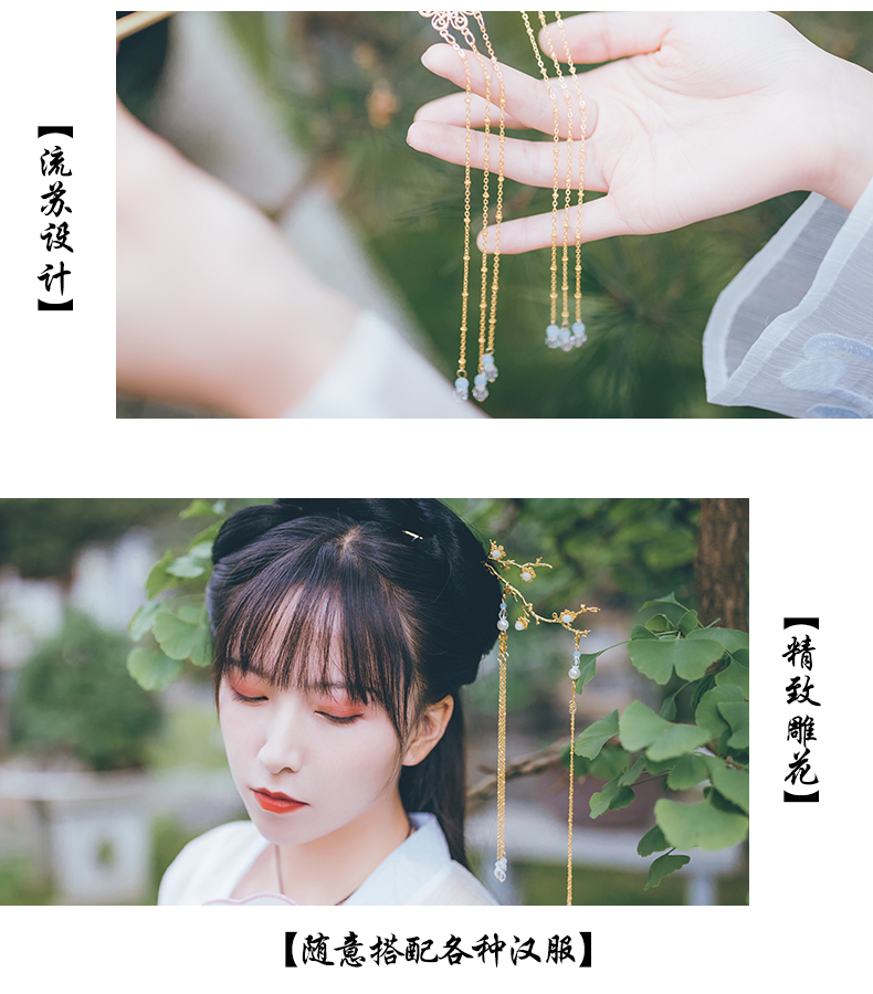 Wanbaozi Hanfu Headdress Female Qiongzhi Jade Leaves Hairpin Ancient Costume Fairy Performance Accessories Step Shake Hairpin Tassel Ancient Style Hair Accessory Golden Hairpin with Two Tassels