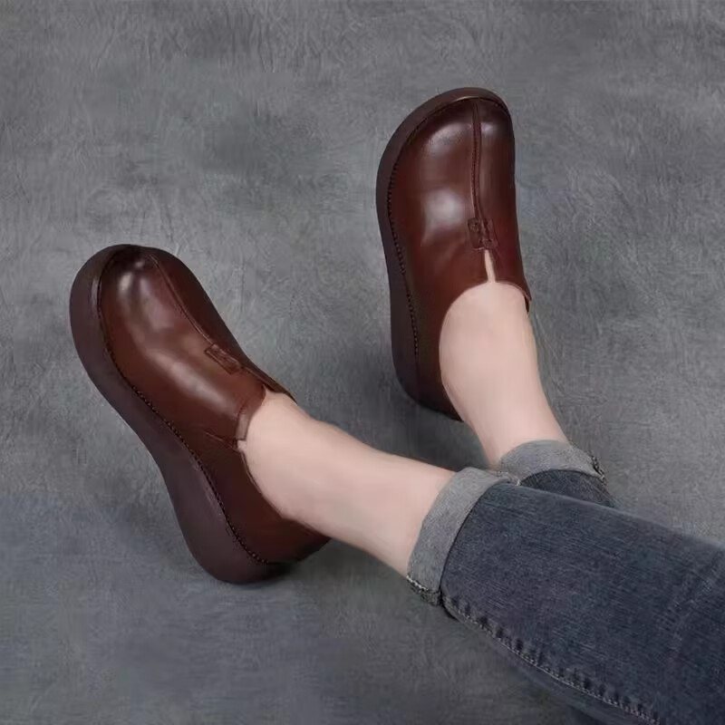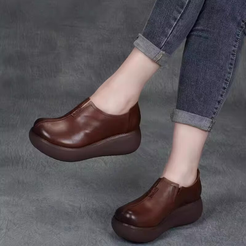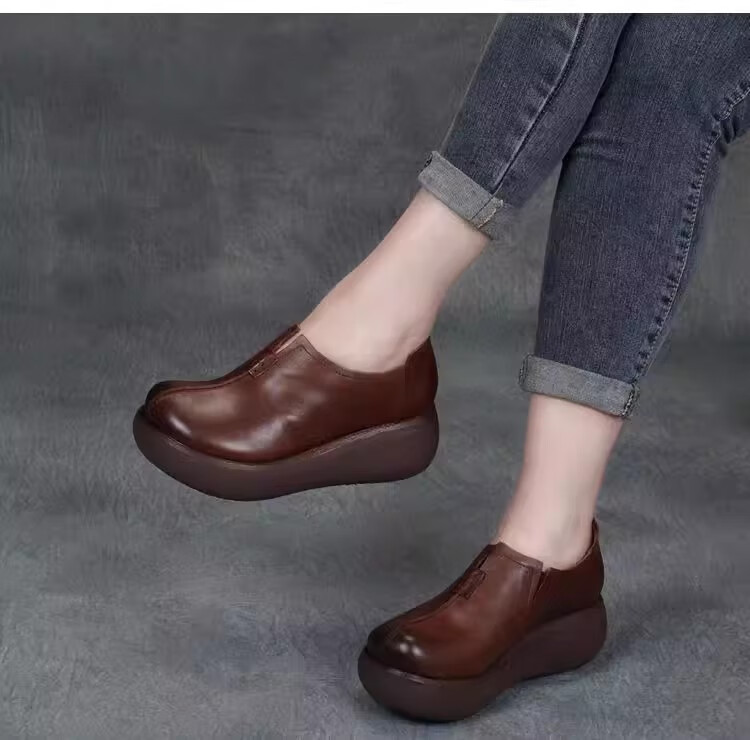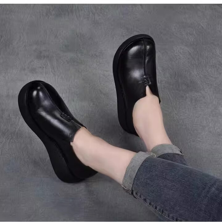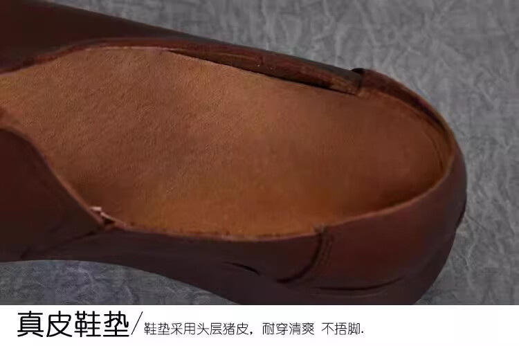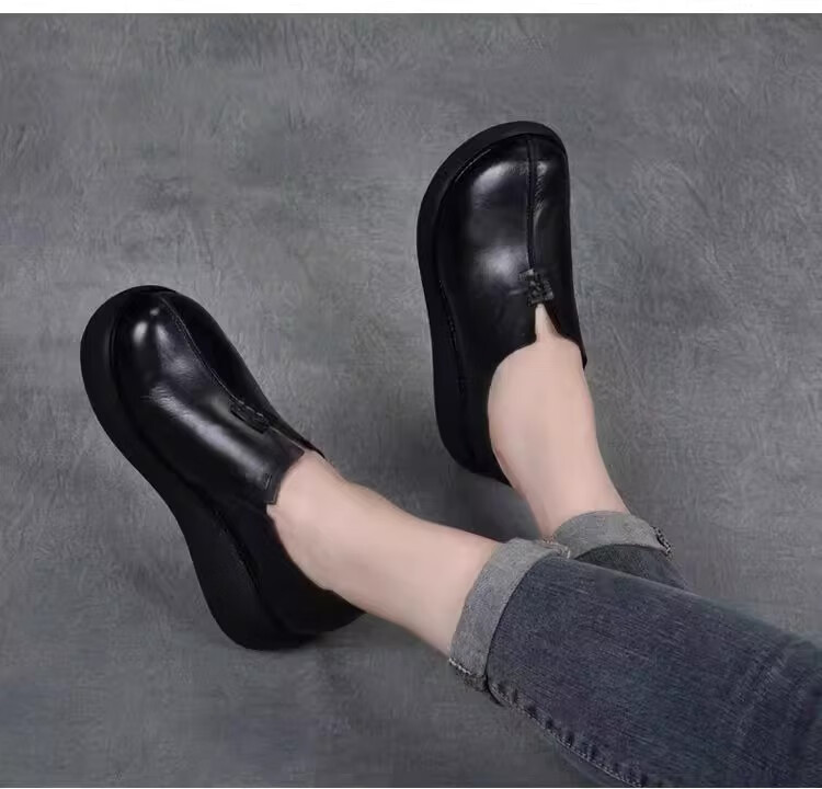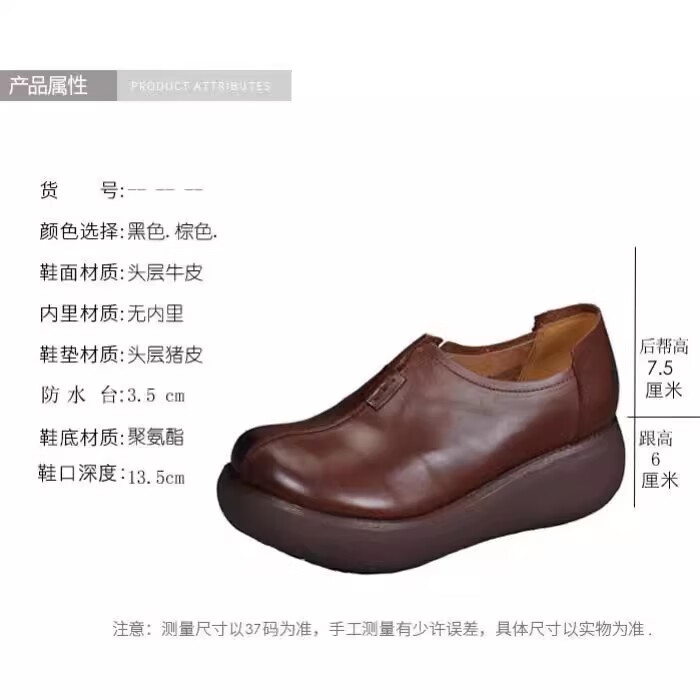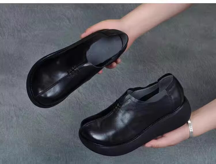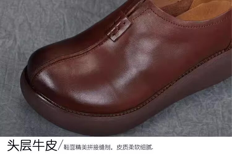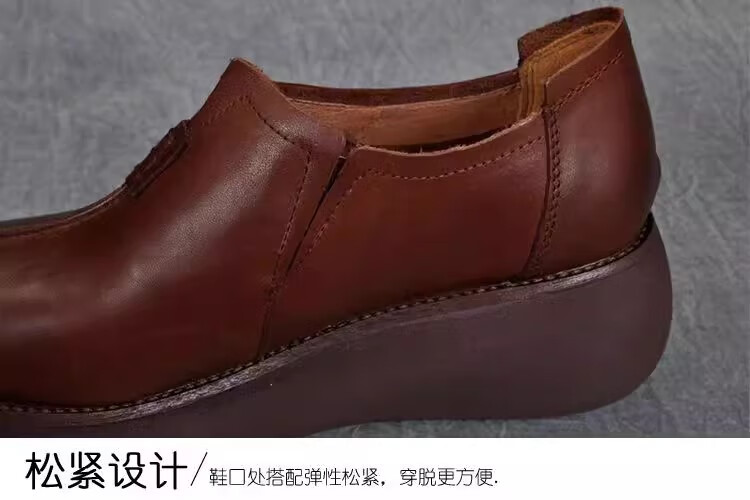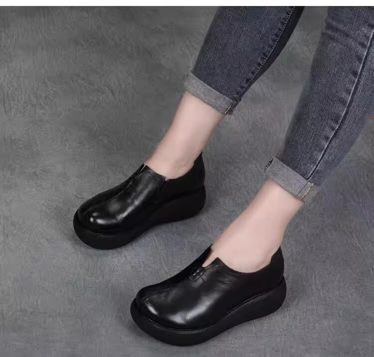 Jin Gong retro ethnic style handmade leather shoes for women round toe deep mouth platform platform wedge single shoes mother leather shoes black 39