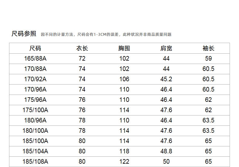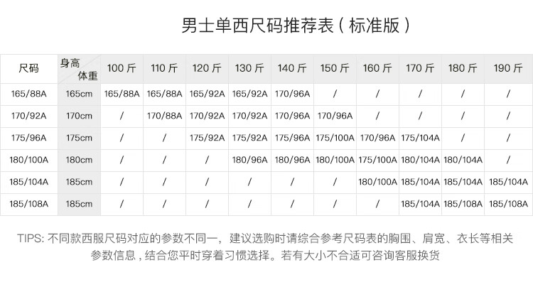 China (cm) 165 / 88-90 170 / 96-98 175 / 108-110 180 / 118-122 185 / 126-130