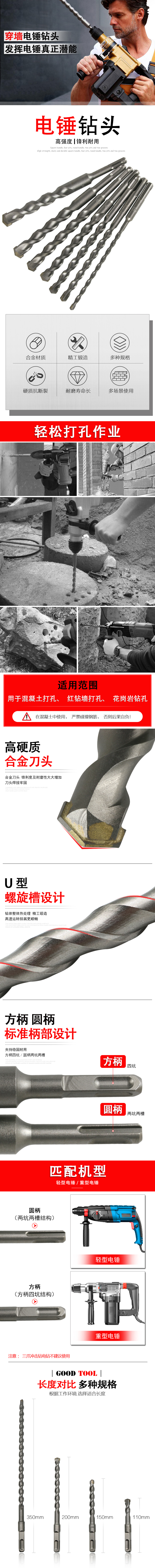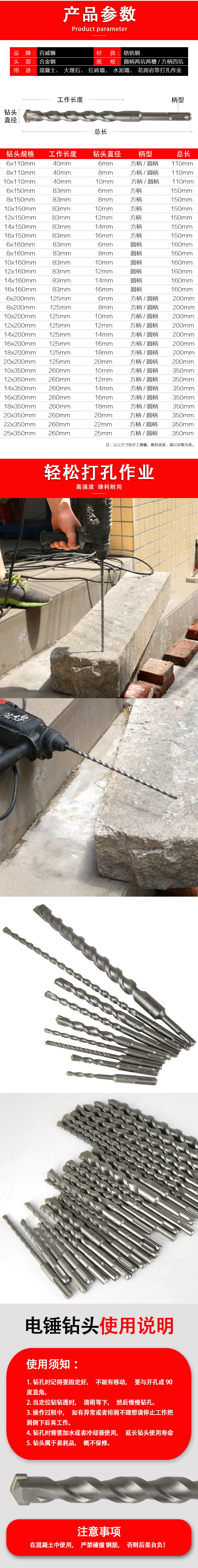 Budweiser Lion Electric Hammer Drill Bit for Concrete Cement Wall Extended Impact Rotary Square Handle Round Handle Wall Drill Four Pit Two Pit Two Slot Alloy Drill Bit 350mm 6*110mm Round Handle (Single)