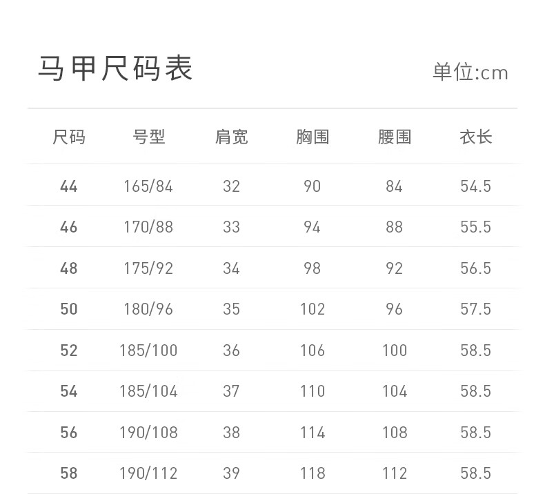 China (cm) 165 / 88-90 170 / 96-98 175 / 108-110 180 / 118-122 185 / 126-130