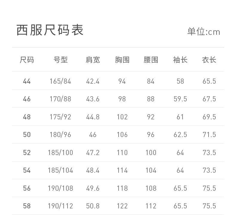 China (cm) 160-165/84-86 165-170 / 88-90 167-172 / 92-96 168-173 / 98-102 170-176 / 106-110