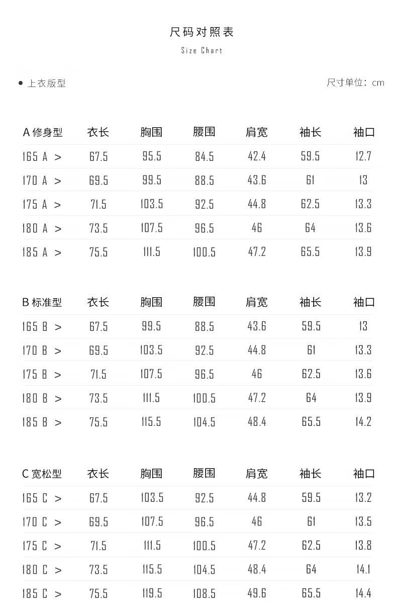 China (cm) 160-165/84-86 165-170 / 88-90 167-172 / 92-96 168-173 / 98-102 170-176 / 106-110