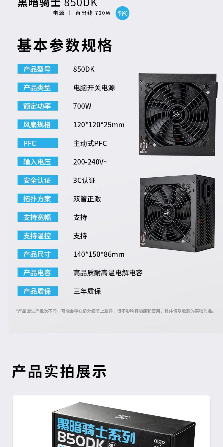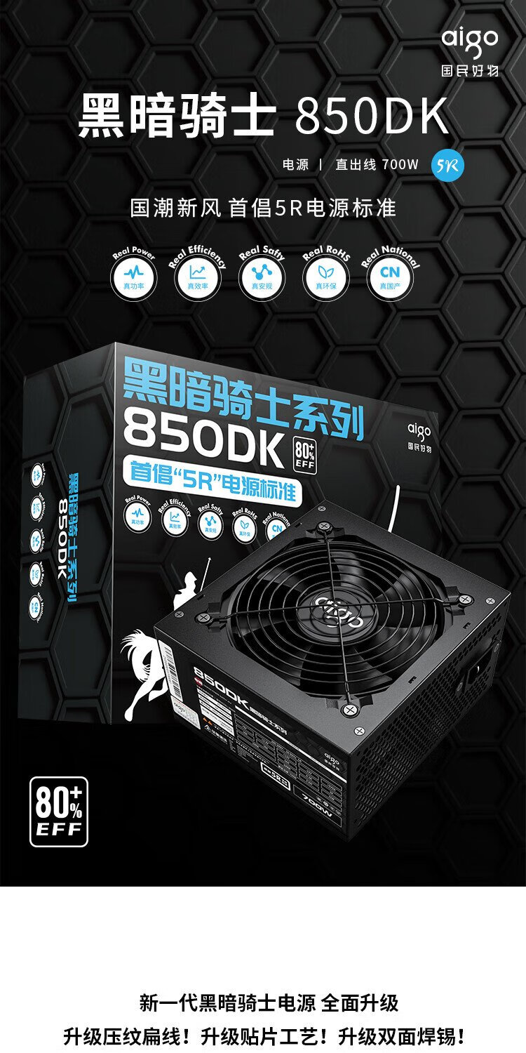 Aigo rated 700W Dark Knight 850DK desktop computer power supply (active PFC/wide temperature control/supports backline/long wire)