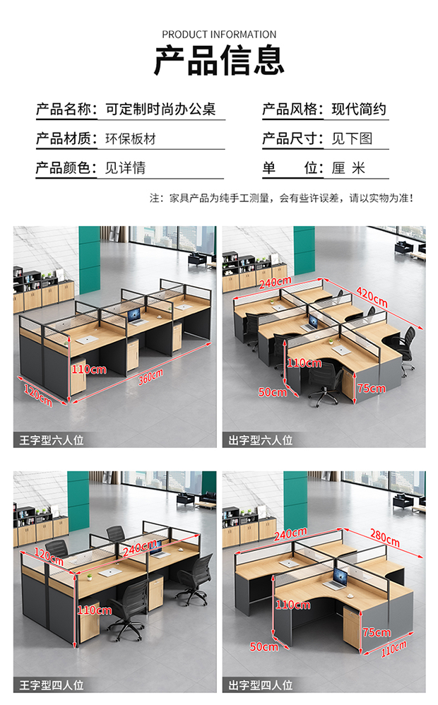 Clasificación de colores Escritorio individual 120*60,Plaza unidireccional con mueble 120*60,Mueble monoplaza recto con sillón 120*60,Biplaza en I sin mueble 120*120,Biplaza en I con mueble 120*120,Biplaza en forma de I con mueble y silla 120*120,Dos personas en forma de E sin gabinete 240*60,Gabinete para dos personas en forma de E con gabinete 240*60,Silla doble en forma de E con mueble 240*60,Tres personas en forma de E 360*60,Tres plazas en forma de E (incluido el gabinete) 360*60,Tres plazas en forma de E (incluidos armarios y sillas) 360*60,Cuatro personas en forma de E 480*60,Cuatro plazas en forma de E (incluido el gabinete) 480*60,Cuatro plazas en forma de E (incluidos armarios y sillas) 480*60,King shape cuatro plazas sin mueble 240*120,King de cuatro plazas con mueble 240*120,Silla King de cuatro plazas con mueble 240*120,King de seis plazas sin armarios 360*120,King de seis plazas con mueble 360*120,Silla King de seis plazas con mueble 360*120,Ocho plazas en forma de rey sin mueble 480*120,Ocho plazas en forma de rey con mueble 480*120,Diez plazas king sin armarios 600*120,Diez plazas en forma de rey con mueble 600*120,Plaza individual en L sin mueble 140*120,Plaza individual en L con mueble 140*120,Biplaza en forma de T sin mueble 240*140,Armario para dos personas en forma de T con mueble 240*140,Tipo F dos plazas sin mueble 280*120,Gabinete para dos personas tipo F 280*120,Tipo de letra cuatro plazas sin mueble 280*240,Tipo de fuente de cuatro plazas con mueble 280*240,Cuatro plazas en cruz sin mueble 280*240,Cuatro plazas en cruz con mueble 280*240,Tipo de letra seis plazas sin mueble 420*240,Tipo de letra seis plazas con mueble 420*240,Sillas presenciales para ocho personas con armarios 480*120,Silla frente a frente para diez personas con mueble 600*120