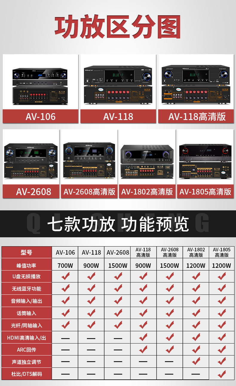 Цветовая классификация 229 безупречная версия Hi-Fi (с HDMI) + безупречное декодирование + объемный звук 5.1 + мощные басы,Флагманская версия 2608 без потерь + объемный звук 5.1 + сабвуфер,Флагманская версия 2608 без потерь (с HDMI) + объемный звук 5.1 + сабвуфер.,2608 HIFI-версия без потерь (с HDMI) + декодирование без потерь + объемный звук 5.1 + мощные басы,1802 версия HIFI без потерь (с HDMI) + настоящий 5.1 + декодирование без потерь + объемный звук 5.1 + мощные басы,Усилитель мощности 1805DTS + настоящий 5.1 + декодирование без потерь + объемный звук 5.1 + сабвуфер,118 Lossless HIFI версия (с HDMI) + безупречное декодирование + объемный звук 5.1 + мощные басы,118 флагманская версия без потерь (с HDMI) + объемный звук 5.1 + сабвуфер,118 флагманская версия без потерь + объемный звук 5.1 + сабвуфер,106 безупречная версия Hi-Fi + безупречное декодирование + объемный звук 5.1 + мощные басы,106 флагманская версия + объемный звук 5.1 + сабвуфер,AV-2608 HIFI-версия без потерь (с HDMI) + декодирование без потерь + объемный звук 5.1 + сабвуфер