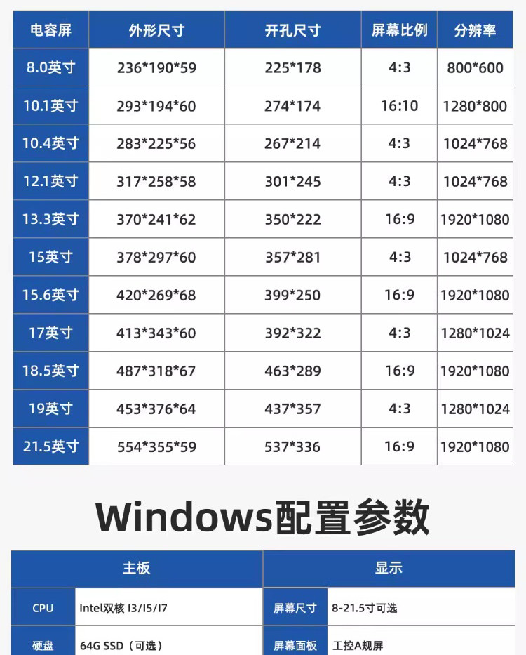 套餐类型 7英寸/工控触摸一体机-电容款,8.4英寸/工控触摸一体机-电容款,10.1英寸/工控触摸一体机-电容款,10.4英寸/工控触摸一体机-电容款,12.1英寸/工控触摸一体机-电容款,13.3英寸/工控触摸一体机-电容款,15英寸/工控触摸一体机-电容款,15.6英寸/工控触摸一体机-电容款,17英寸/工控触摸一体机-电容款,17.3英寸/工控触摸一体机-电容款,18.5英寸/工控触摸一体机-电容款,19英寸正/工控触摸一体机-电容款,19英寸宽/工控触摸一体机-电容款,21.5英寸/工控触摸一体机-电容款,23.6英寸/工控触摸一体机-电容款,27英寸/工控触摸一体机-电容款,32英寸/工控触摸一体机-电容款,43英寸/工控触摸一体机-电容款