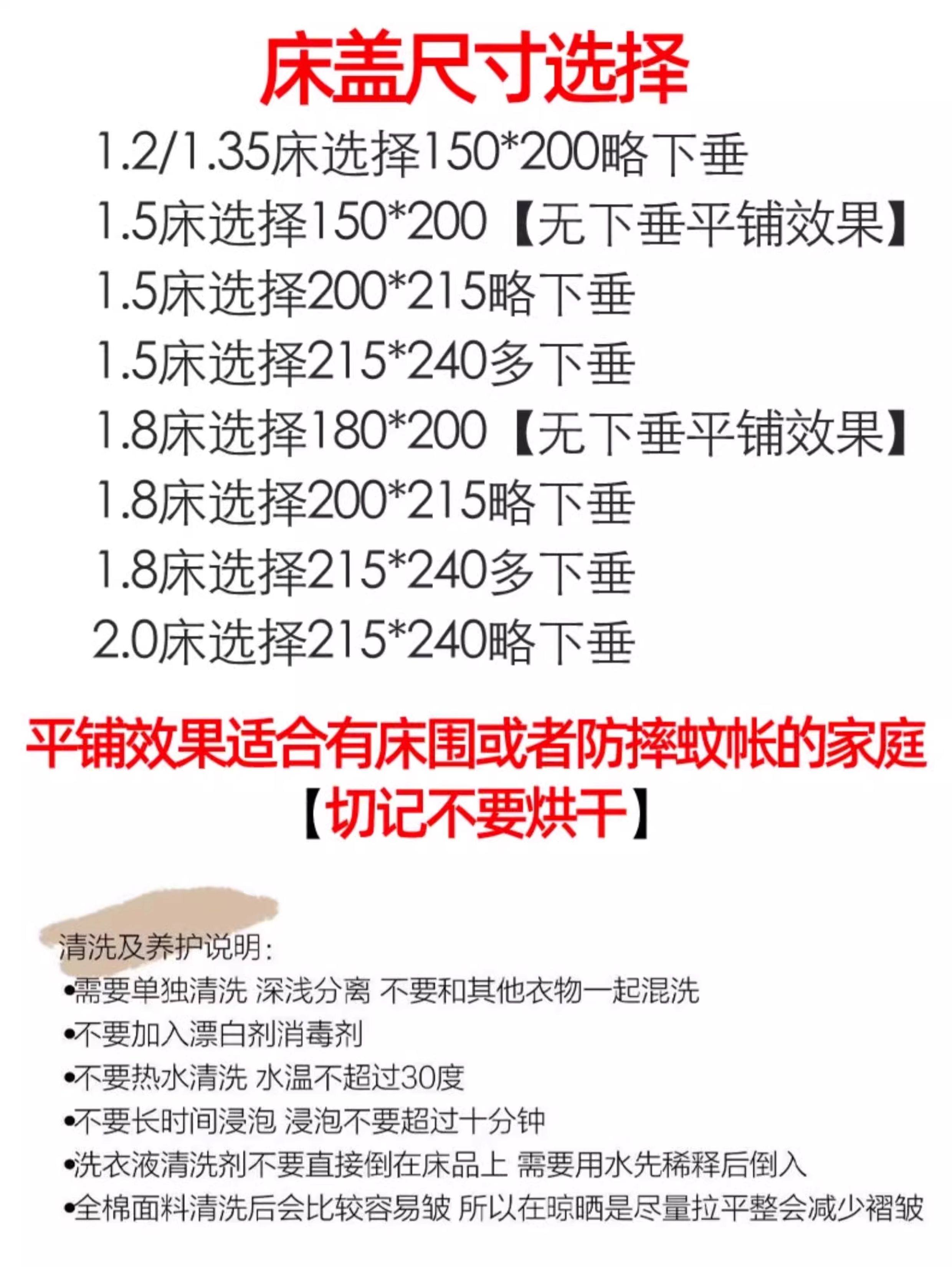 床单/床笠尺寸 单件床盖150x200±5cm【适合1.2/1.5床】,单件床盖180x200±5cm【适合1.35/1.8床】,单件床盖200x215±5cm【适合1.5/1.8床】,单件床盖215x240±5cm【适合1.5/2.0床】,三件套床盖150x200±5cm+枕套一对(48*74),三件套床盖180x200±5cm+枕套一对(48*74),三件套床盖200x215±5cm+枕套一对(48*74),三件套床盖215x240±5cm+枕套一对(48*74),需要定制尺寸联系客服,页面所有花色都可以定制
